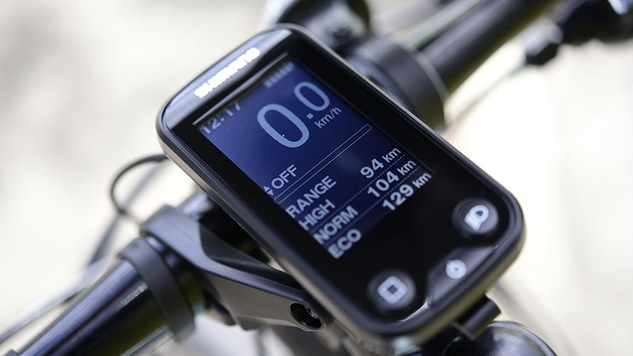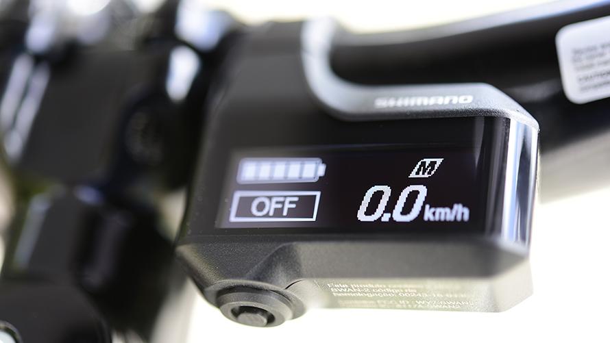 シマノ製の液晶サイクルコンピューターを搭載。走行距離や走行速度に加え、アシスト力やバッテリー残量を確認できます。