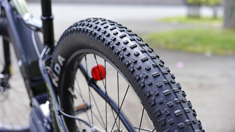 27.5×2.6サイズのワイドタイヤ。タイヤのグリップ力と電動アシストによって高い登坂性を実現します。