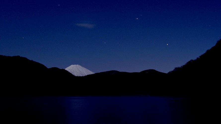 「ザ・プリンス 箱根芦ノ湖」の中庭からは芦ノ湖と富士山が夜空と重なりとても美しい景色となります。