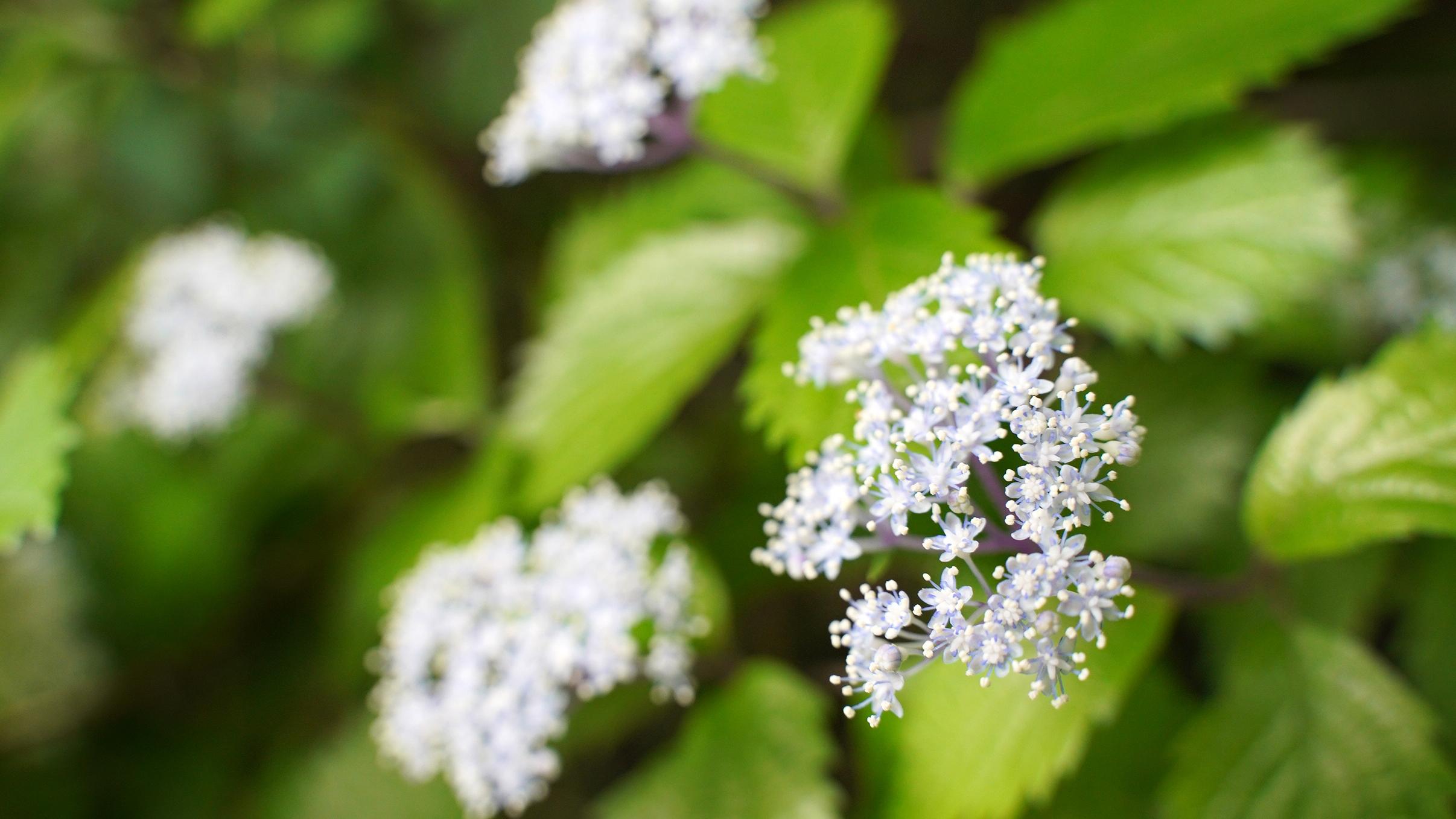 ヤブデマリ、ガマズミ、ミズキ、サンショウバラ、ヤマボウシ、エゴノキ、ニシキウツギ、サラサドウダン、リョウブ、サワアジサイ、コアジサイ、ツルアジサイ、ノリウツギ、イワガラミ、タンナサワフタギ、ホオノキ、カマツカなどの花
