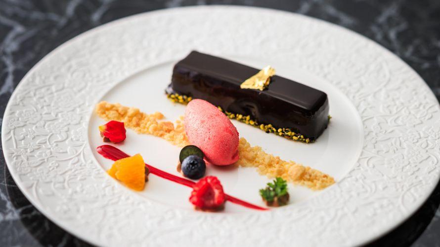 山麓紅茶を使用した香り高いチョコレートムースを、爽やかな酸味のラズベリーのシャーベットとご一緒にお楽しみください。