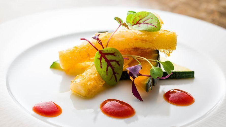 「スタイリッシュに仕上げた湯葉巻きニョッキのフライ トマトソース」