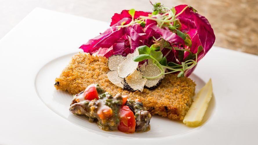 大豆ミートにトリュフを合わせカツレツに仕上げました。マスタードが入った甘酸っぱいバルサミコソースと共にお召しあがりください。