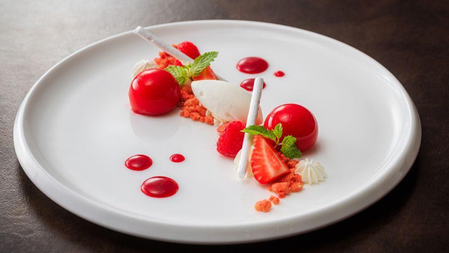 「ラズベリーのムース 苺のクランブルきんたろうミルクアイス添え」