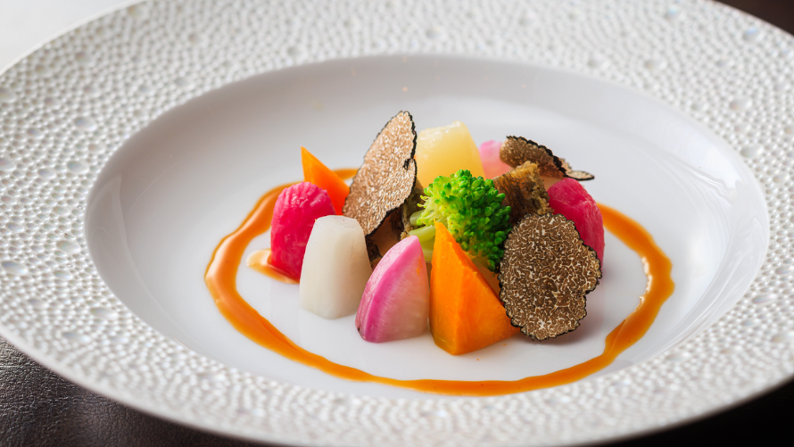 「アワビのソテー根菜のミジョテ トリュフ風味」