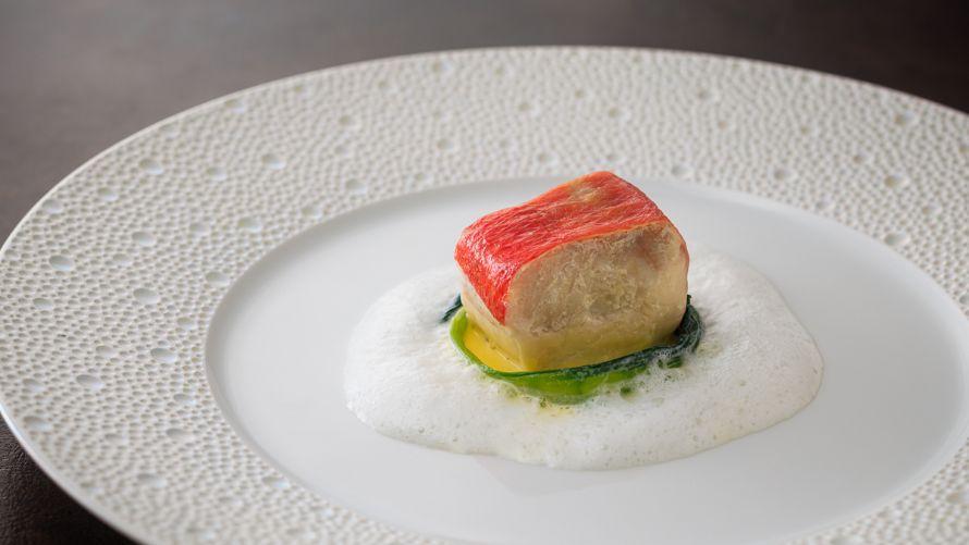 「金目鯛のヴァプール カリフラワーとパルメザンチーズのエミュルション 南箱根の厳選バターソース」