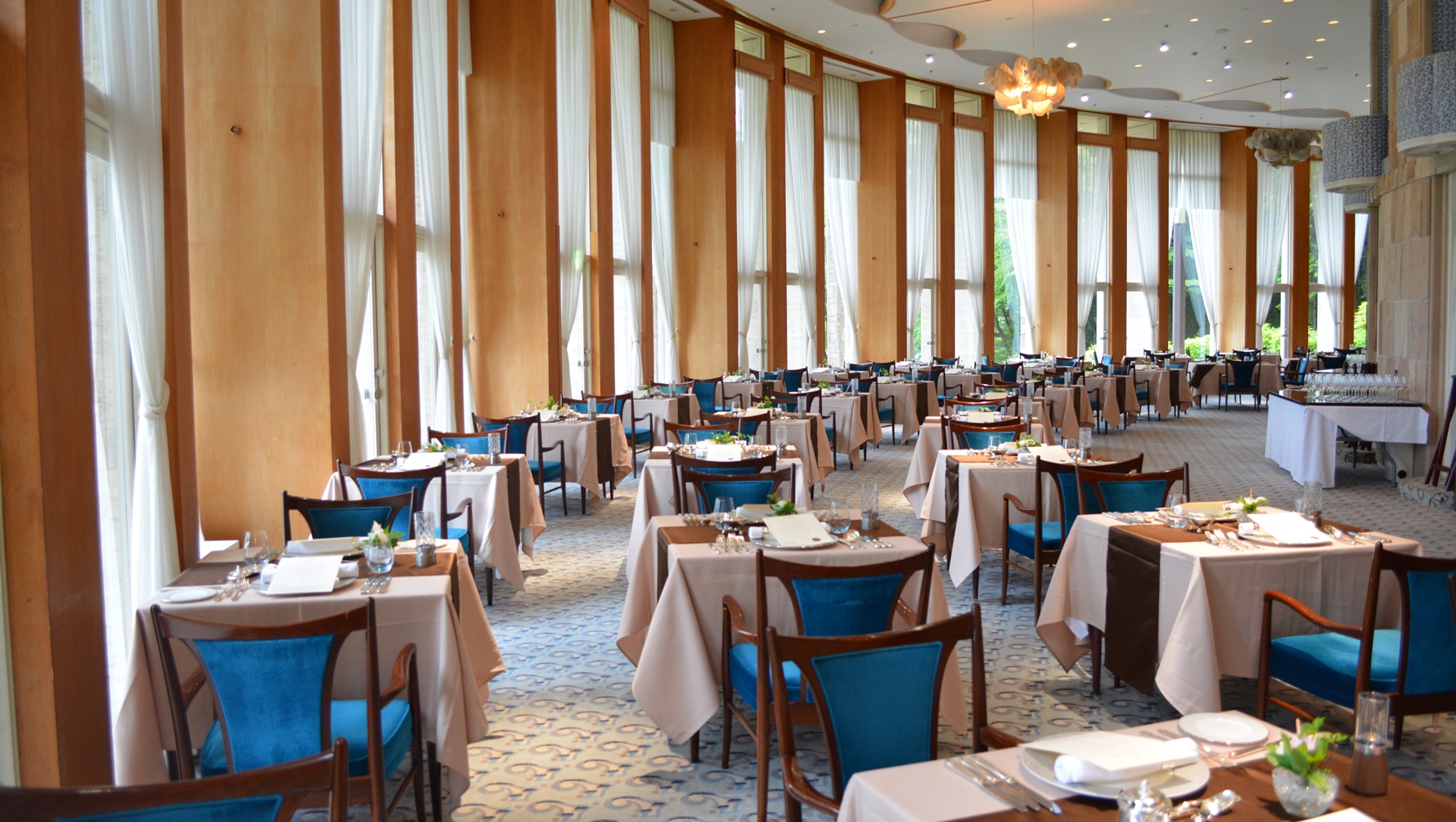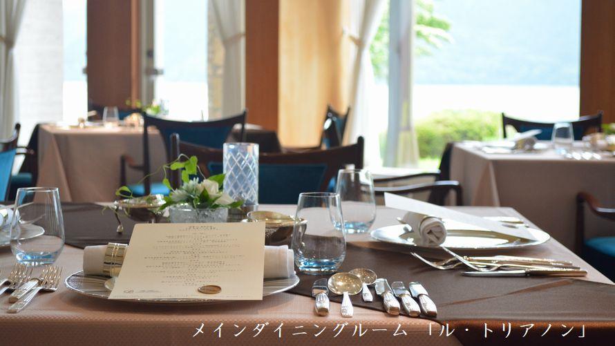 客室棟とレストランで構成された特徴的な円形の建物に位置するメインダイニングルーム ル・トリアノン。店内に入るとその向こうには富士山や芦ノ湖が見える自然の風景が広がり思わず深呼吸したくなる景色が広がります。建築当初から変わらぬ雰囲気の中、フレンチコースをお愉しみください。