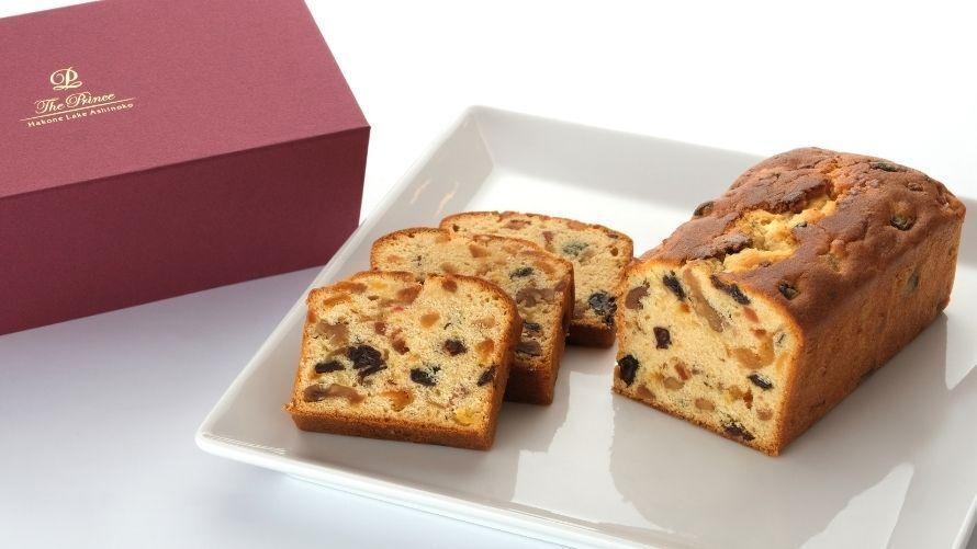 ザ・プリンス 箱根芦ノ湖オリジナルのフルーツケーキです。あんず・クルミ・レーズンなどをラム酒やグランマニエに漬け、丁寧に焼きあげました。