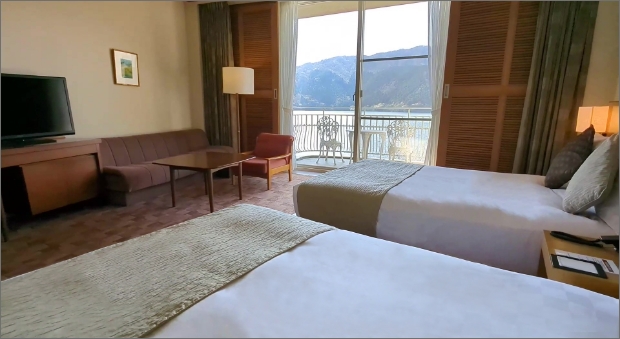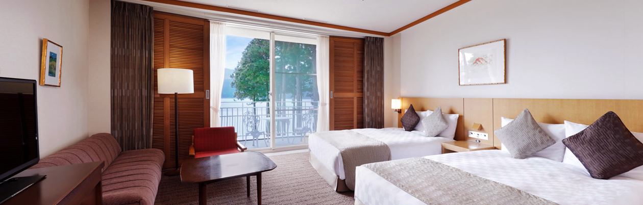 静かな湖畔にたたずむお部屋の窓からは、美しい芦ノ湖や山々の景色を望めます。落ち着いたインテリアと広いバルコニーで箱根の大自然をご満喫いただけます。