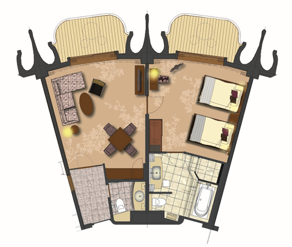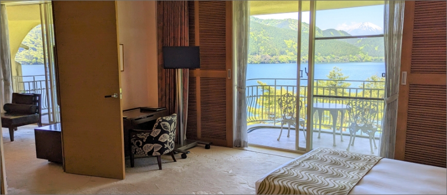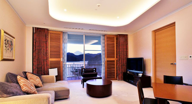 ゆったりとした空間とモダンで落ち着いたデザイン。富士山と芦ノ湖を望む絶景のお部屋です。リビングルーム、ベッドルームのいずれにも広々としたバルコニーを備えます。