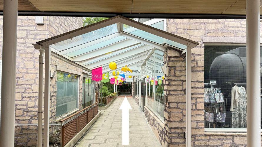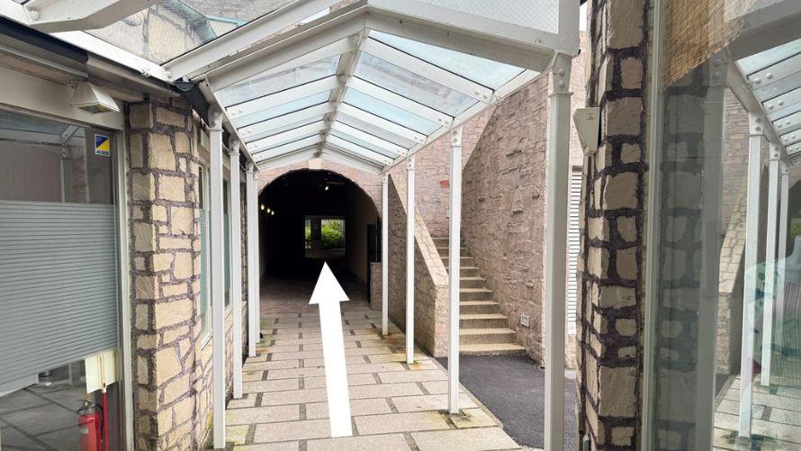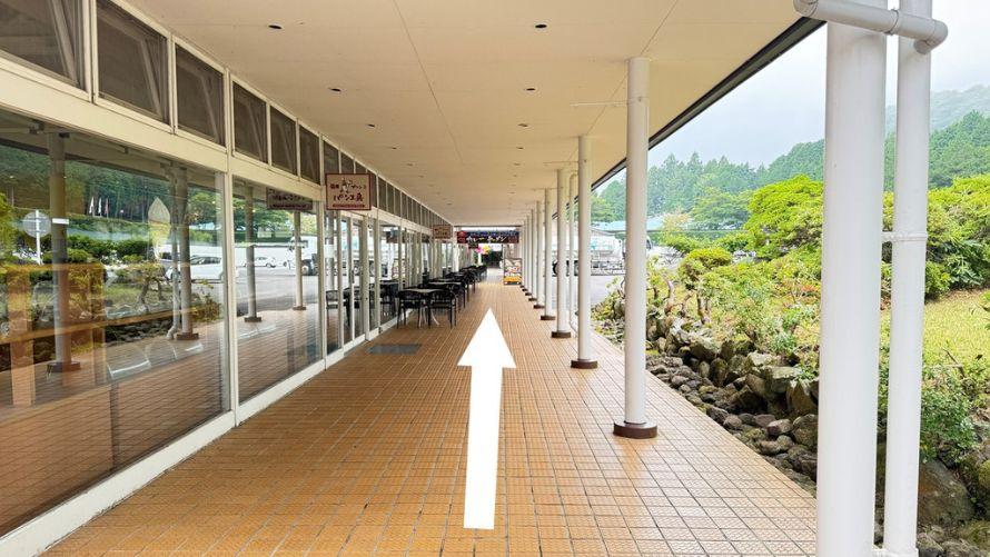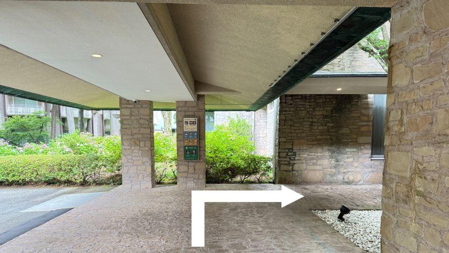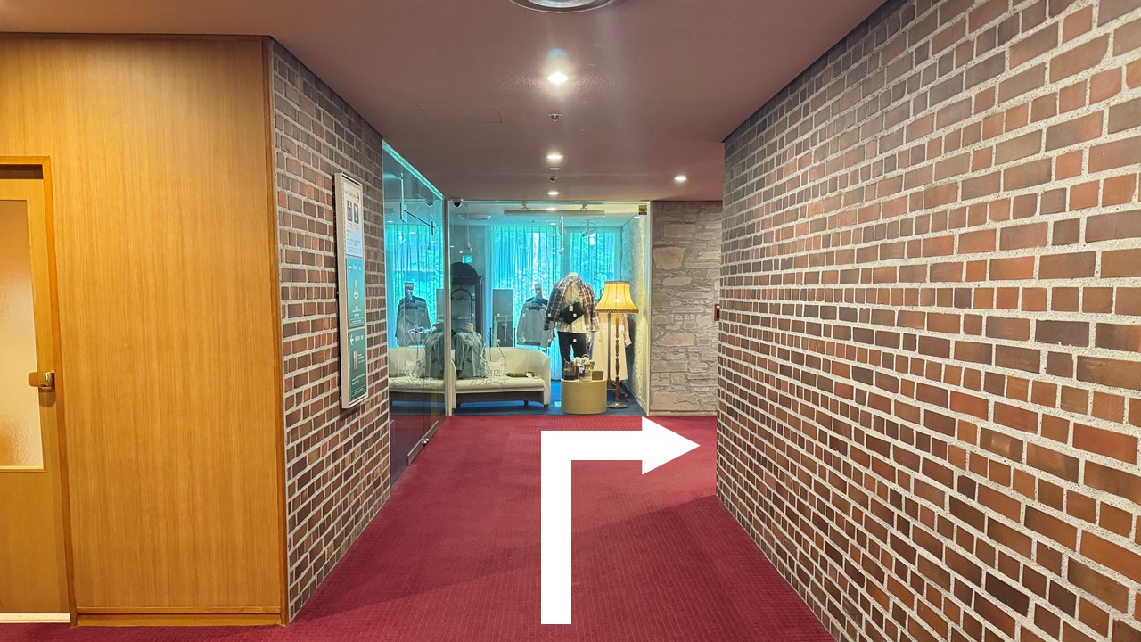 アーケード(屋根付き通路)を直進し、突き当たりからホテル本館へ続く連絡通路へとお進みください。