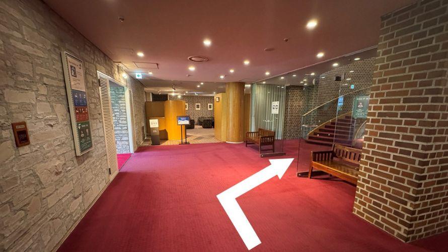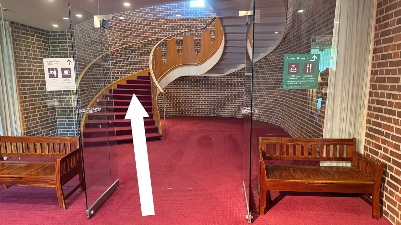通路を進み、突き当たりを右へ曲がると右手に階段がございます。