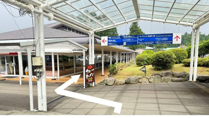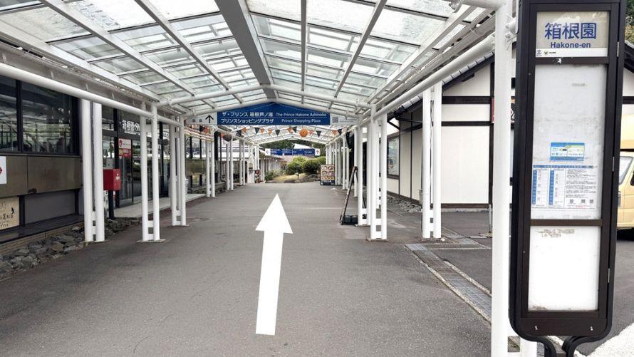 箱根園バス停で下車後、「プリンスショッピングプラザ/ザ・プリンス箱根芦ノ湖」と書かれた共通の案内看板を目印に、「プリンスショッピングプラザ」の建物へお進みください。屋根付きの通路がございます。