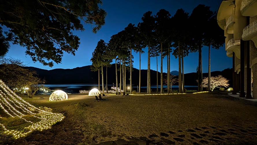 富士山・芦ノ湖を望むホテル中庭では、イルミネーションが点灯。