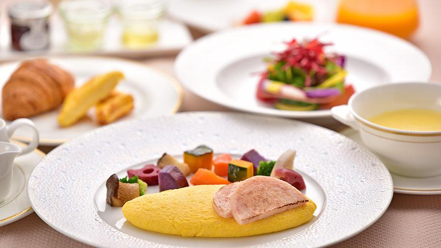 「ウフ・ムーレット箱根芦ノ湖トリアノンスタイル ベーコンと温野菜添え」または「プレーンオムレツ箱根西麓牛のミートソース富士湧水ポークハムステーキ」