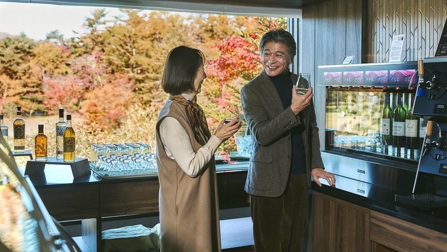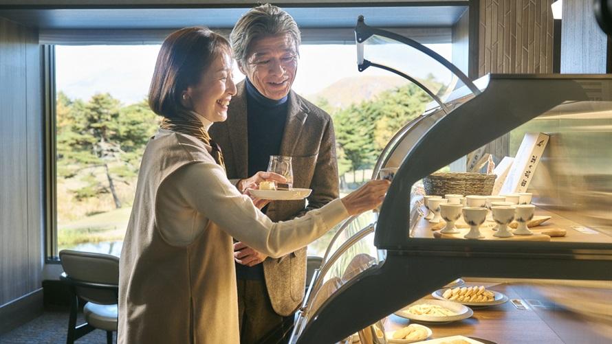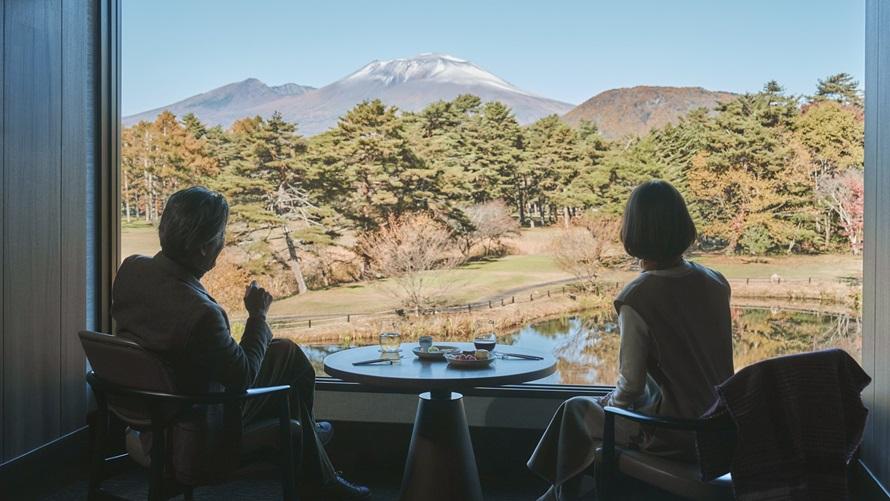 目の前に広がる雄大な浅間山を中心とした四季折々の自然を五感で味わいながら、ゆっくりと会話を楽しめるラウンジ。自然との調和を大切にし、ラウンジで使用する食器やカトラリー、グラスにはサステナブルな素材を採用しています。2名掛けのテーブルが7卓と、最大6名まで利用できる半個室を2部屋ご用意しており、利用シーンに合わせてよりプレミアムなくつろぎの時間をお楽しみいただけます。