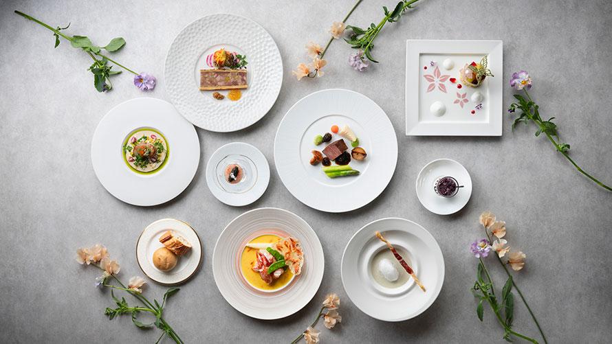 甘エビのマリネ キャビア オシェトラ/パテ・アン・クルート フォレスティエール/帆立貝のミ・キュイ プランタニエ/新玉ねぎのヴルーテ イベリコ生ハムを添えて/オマール海老のポッシェ ホワイトアスパラガス ブール・ド・サフラン/グラニテ/トリュフとモリーユ茸の芳醇な香りに包まれた和牛フィレ肉/フロマージュ/苺とグリオットチェリーのコンポート ショコラオランジュのコンポジション/コーヒーまたは紅茶 ミニャルディーズ