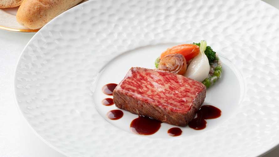 ・7/18~9/7 和牛ロース肉のポワレ 季節の彩り野菜 ソース ヴァン・ルージュ または 和牛フィレ肉のポワレ 温野菜添え ソース・トリュフ(+\3,800)