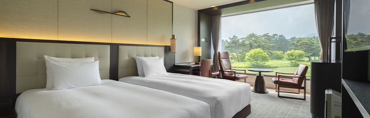 2025年7月にスーペリアツインルームの一部客室をリニューアル。室内の家具や絨毯を刷新いたしました。どのお部屋からも正面に浅間山を望み、絵画のような軽井沢の四季をお楽しみいただけます。