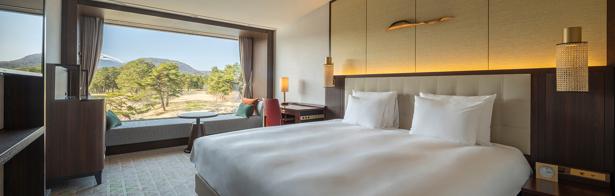 2025年4月リニューアル。ゴルフコースの開けた景色の向こうに浅間山を望むピクチャーウインドウを生かしたデイベッドとキングベッドを新たに設置し、より開放的にお寛ぎいただけます。エグゼクティブラウンジをご利用になれます。