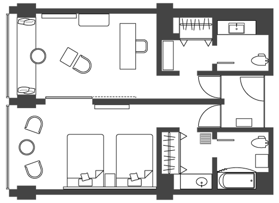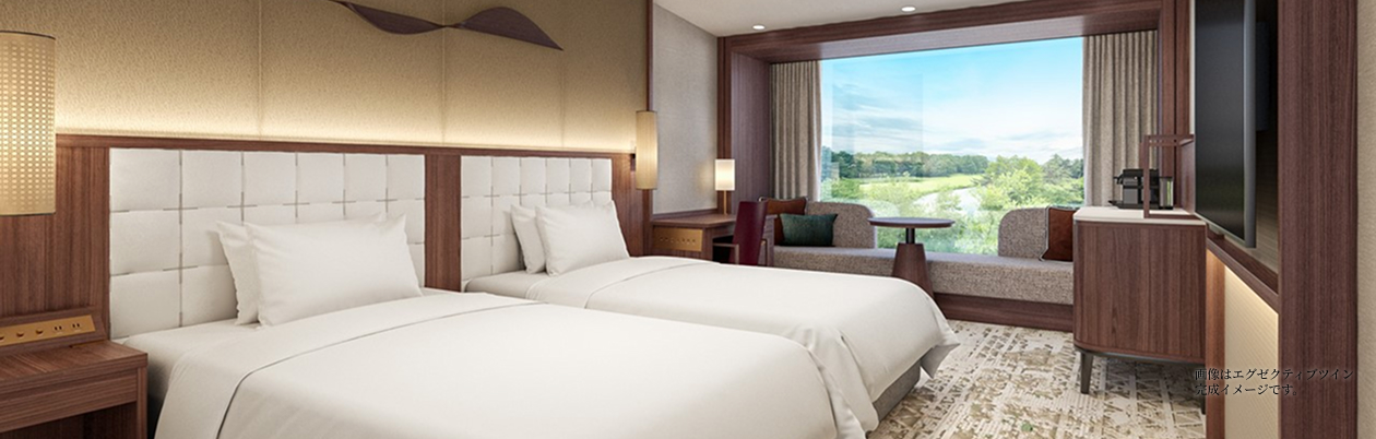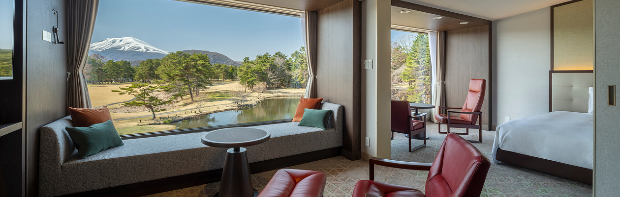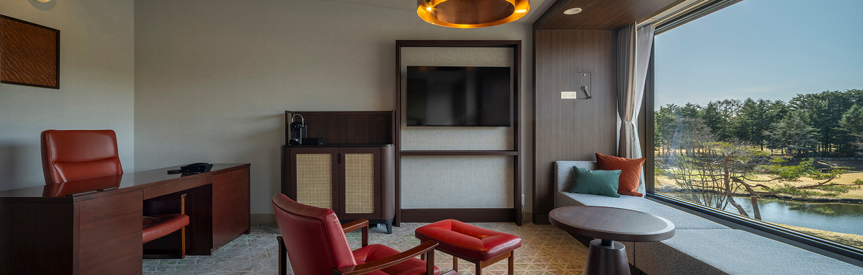 2025年4月リニューアル。洗練されたインテリアのリビングルームにはライティングデスクもあり、ちょっとしたデスクワークなどにもご利用いただけるゆとりある空間です。エグゼクティブラウンジをご利用になれます。