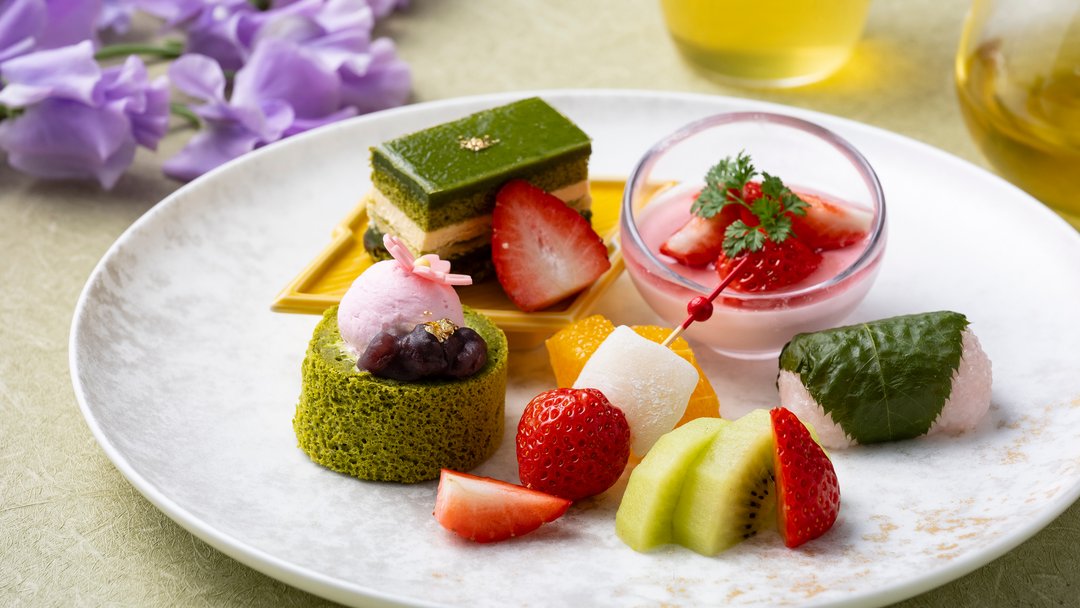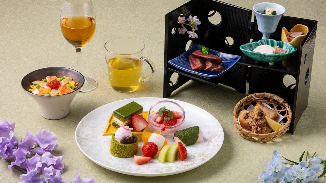 佐賀・嬉野茶の香り豊かな一杯から始まる春のアフタヌーンティー。桜豆腐や国産牛、海老真丈の前菜、彩りちらし寿司に青ほうじ茶。甘味には桜と抹茶、旬の苺を揃え、季節の味わいを少しずつお楽しみいただけます。