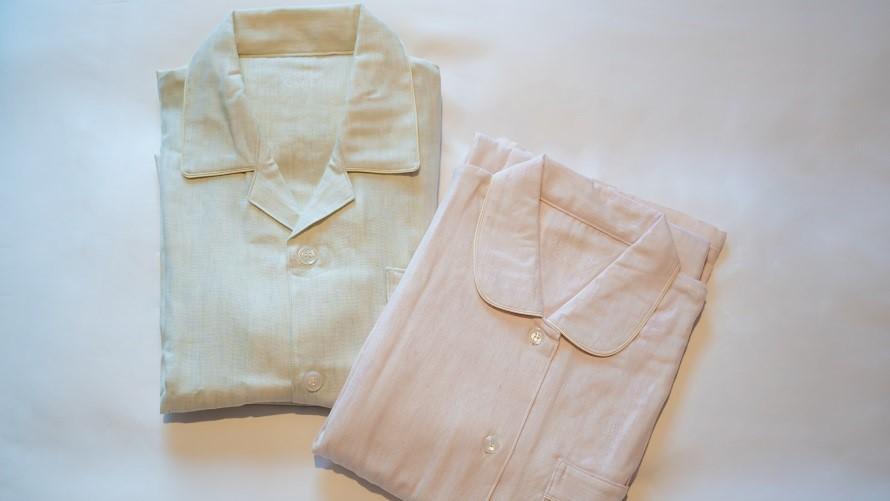 お持ち帰りいただけるSUIMIN CAREの草木染めガーゼパジャマなど、