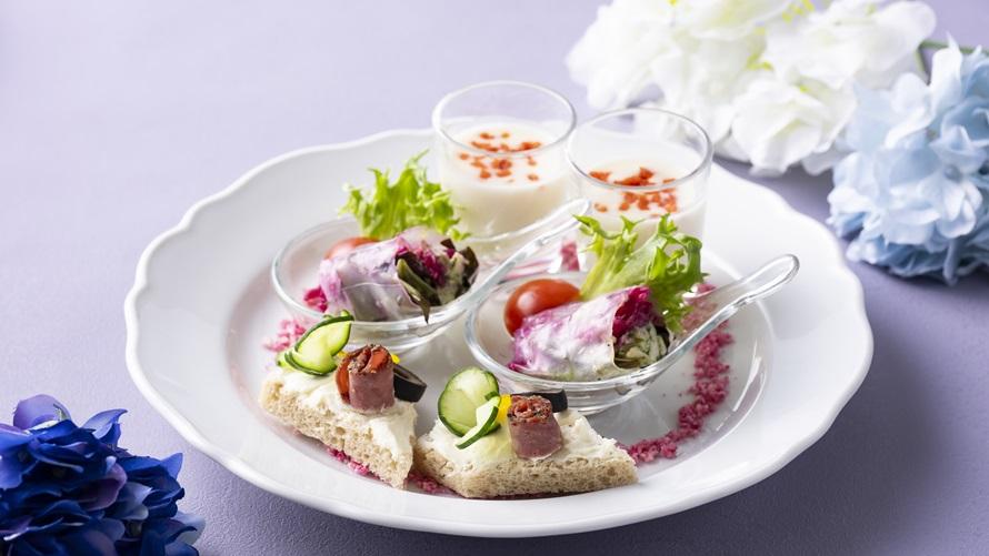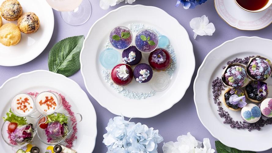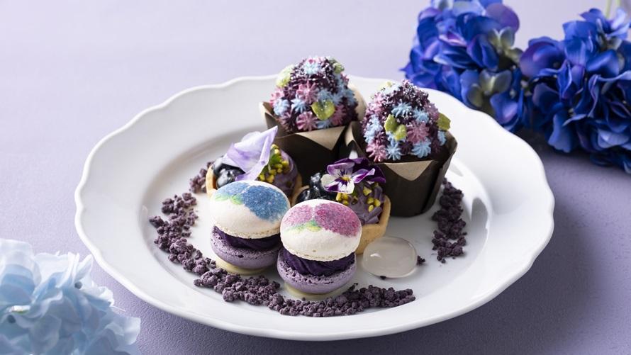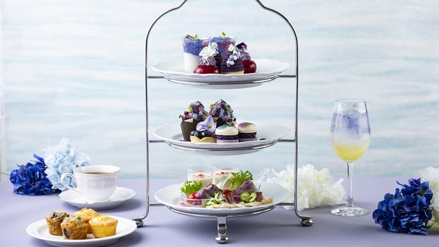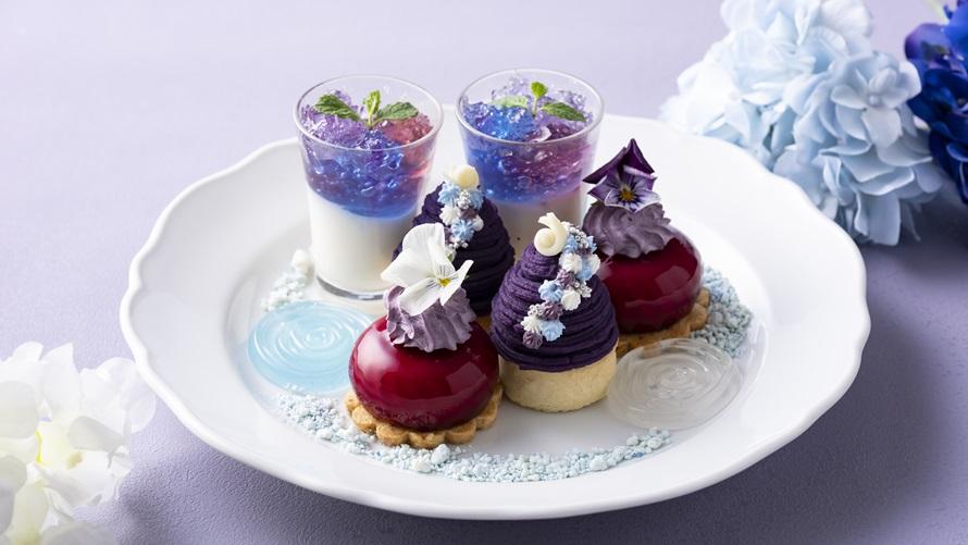 紫陽花の繊細な色の移ろいを、紫や青のグラデーションで表現したフォトジェニックなアフタヌーンティーを