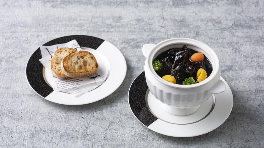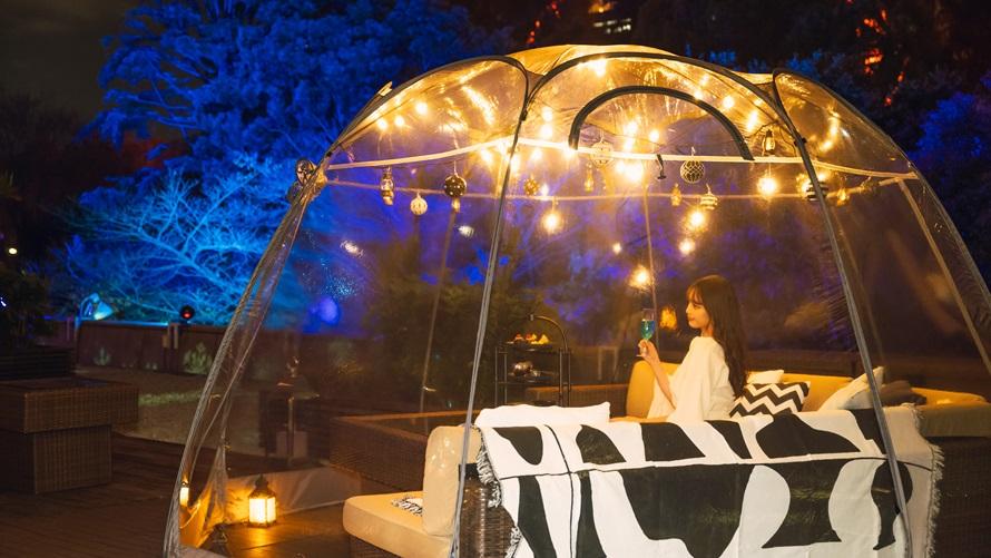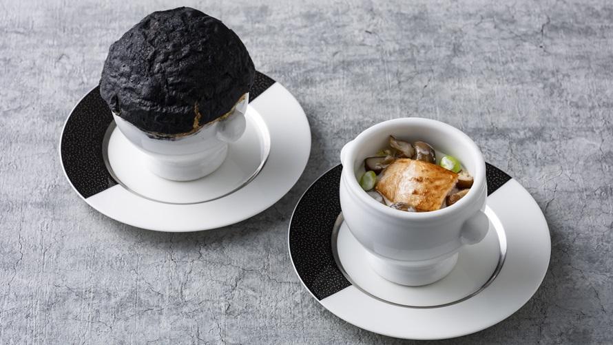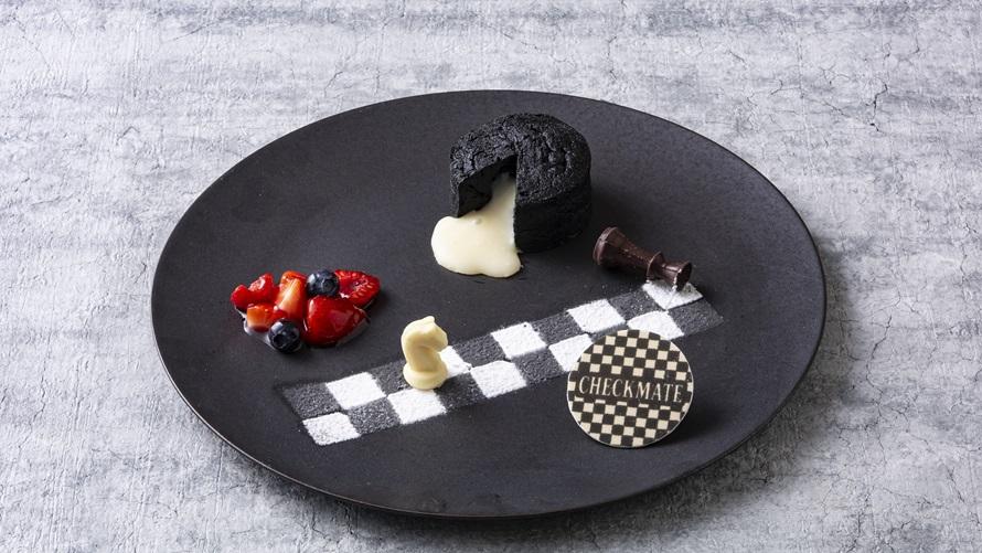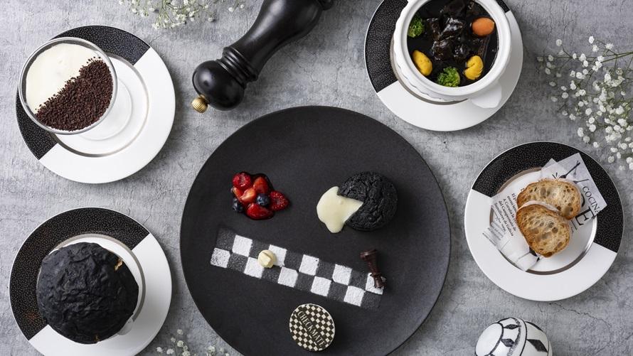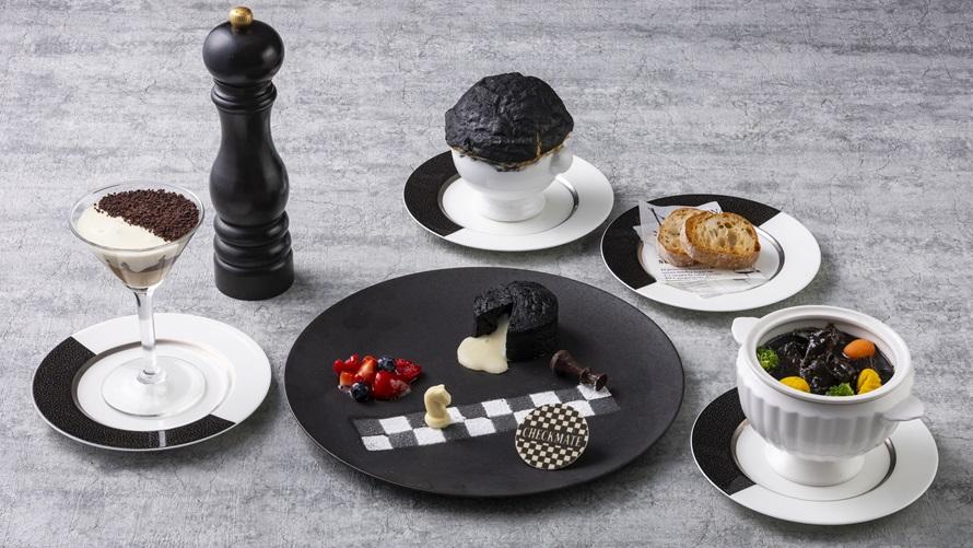 今年の冬のタワービューテラスは「モノクロ」をテーマに開催!ドームテントに足を踏み入れるとモノクロの世界に迷い込んだような、白と黒のコントラストが際立つ装飾を施しております。料理には、竹炭を練りこんだパイをかぶせたサーモングラタンや、チェスをイメージしたフォンダンショコラのプレートなど「モノクロ」を表現。