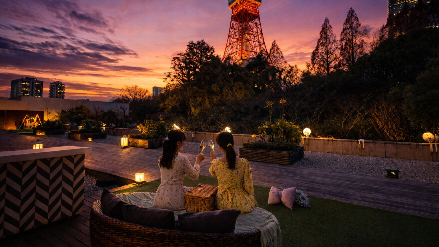 今年の春のカフェ&バー タワービューテラスはピクニックをテーマに開催。バスケットいっぱいに詰めた彩り豊かなフードと、桜をイメージしたオリジナルドリンクを堪能したあとは、ラウンドソファから東京タワーを優雅に眺める特別な春のひとときをお過ごしいただけます。昼と夜、違った雰囲気のピクニックを、絶景テラスで味わってみてはいかがでしょうか。
