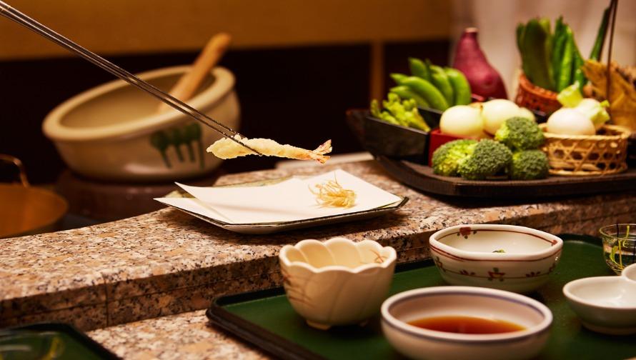「天ぷら処 福佐」のカウンターで板前が提供するかつての東京プリンスホテルのクオリティをお楽しみください。