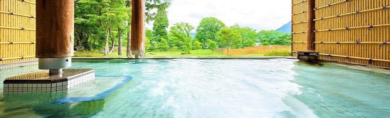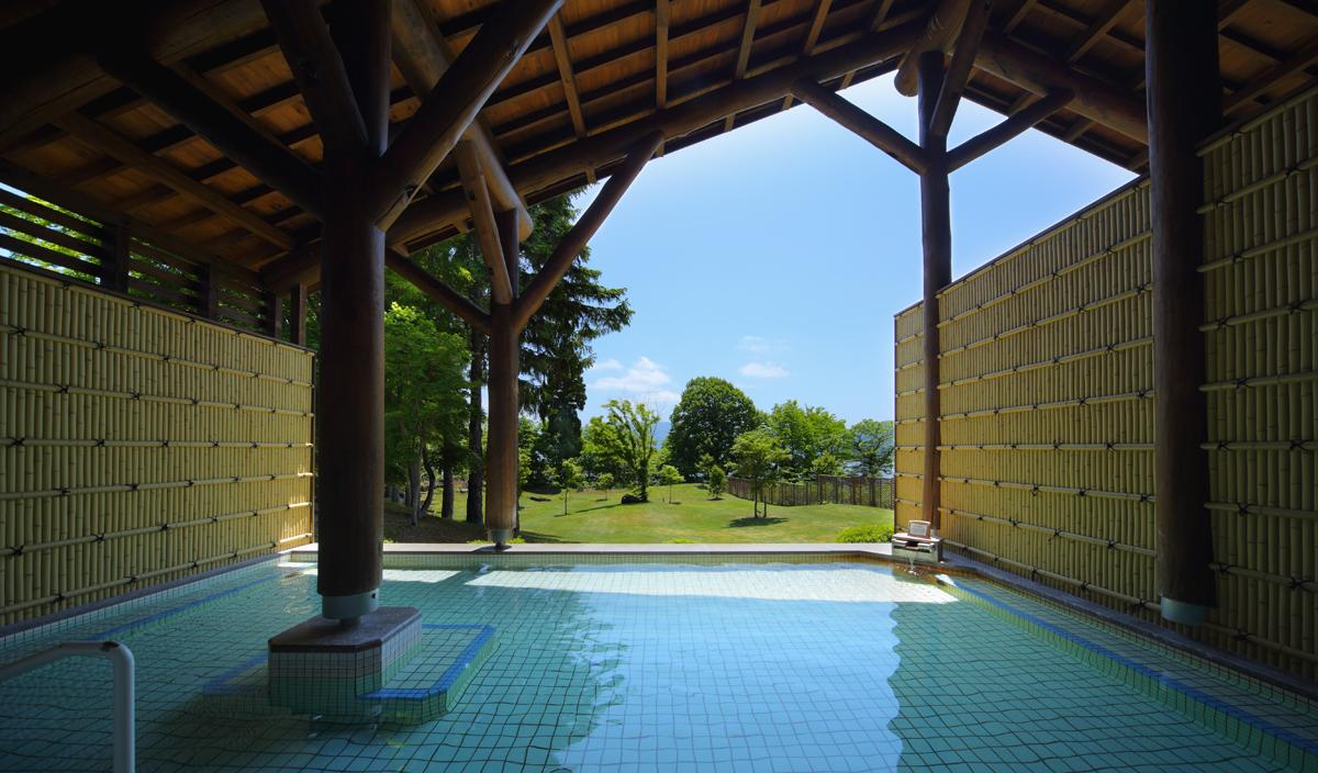 開放感たっぷりの露天風呂の目の前には芝生の庭が広がり、空の青さと木々の緑が美しいコントラストを見せ、ゆったりとリラックスした時間が過ごせます。