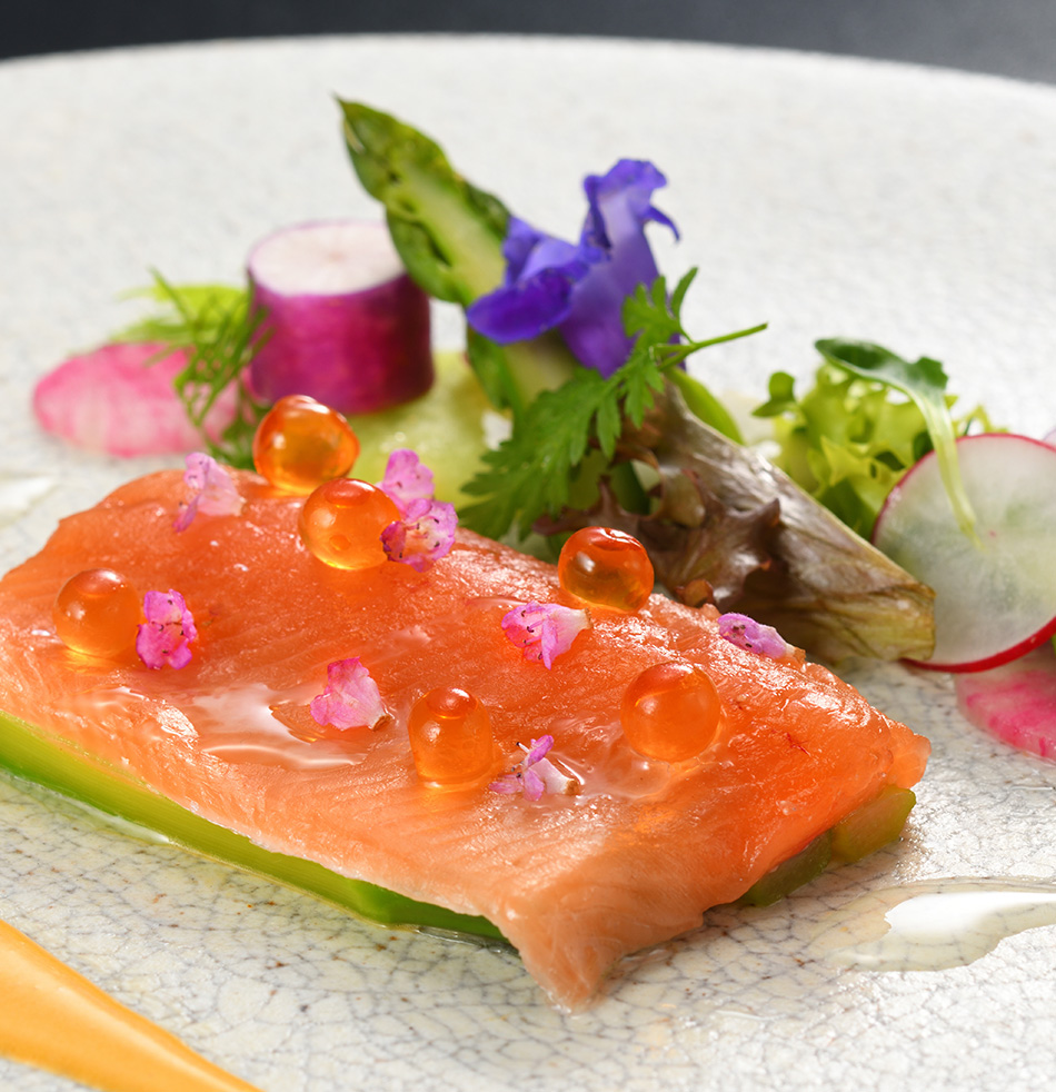 ヒメマスは、海に出ることなく、生涯を湖で過ごす紅鮭のことです。冷たく澄んだ水質でしか育たないため、その生息地は限られ、十和田湖ですら定着させるのに何年もかかり、その話は映画にもなりました。ヒメマスがメインの食材として重宝されるのは、言うまでもなく美味だから。ピンク色の身は脂がのっていて甘く、とろけるような食感が、食した方を虜にしてしまいます。十和田プリンスホテルでも一押しのヒメマス料理は、来ていただいた全てのお客さまに食べていただきたい一皿です。