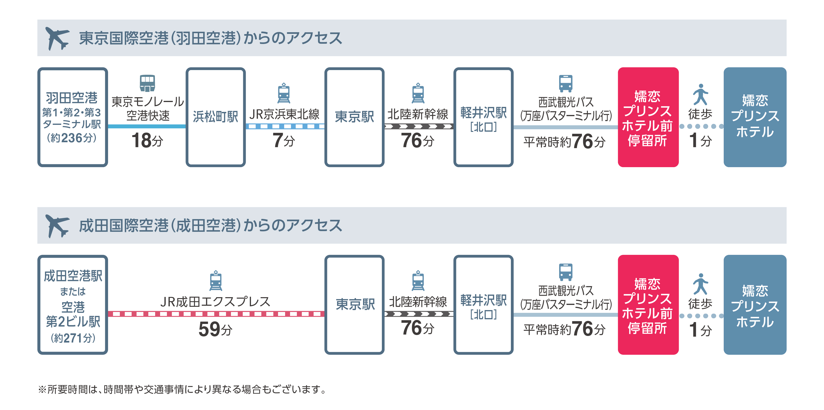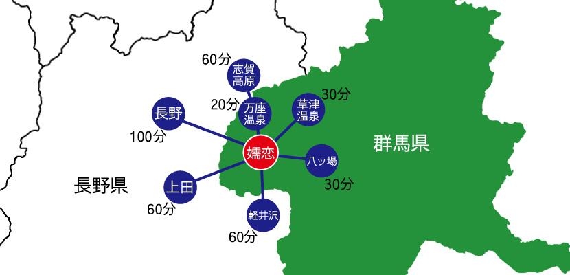 - 上信越自動車道碓氷軽井沢I.C.から約60分