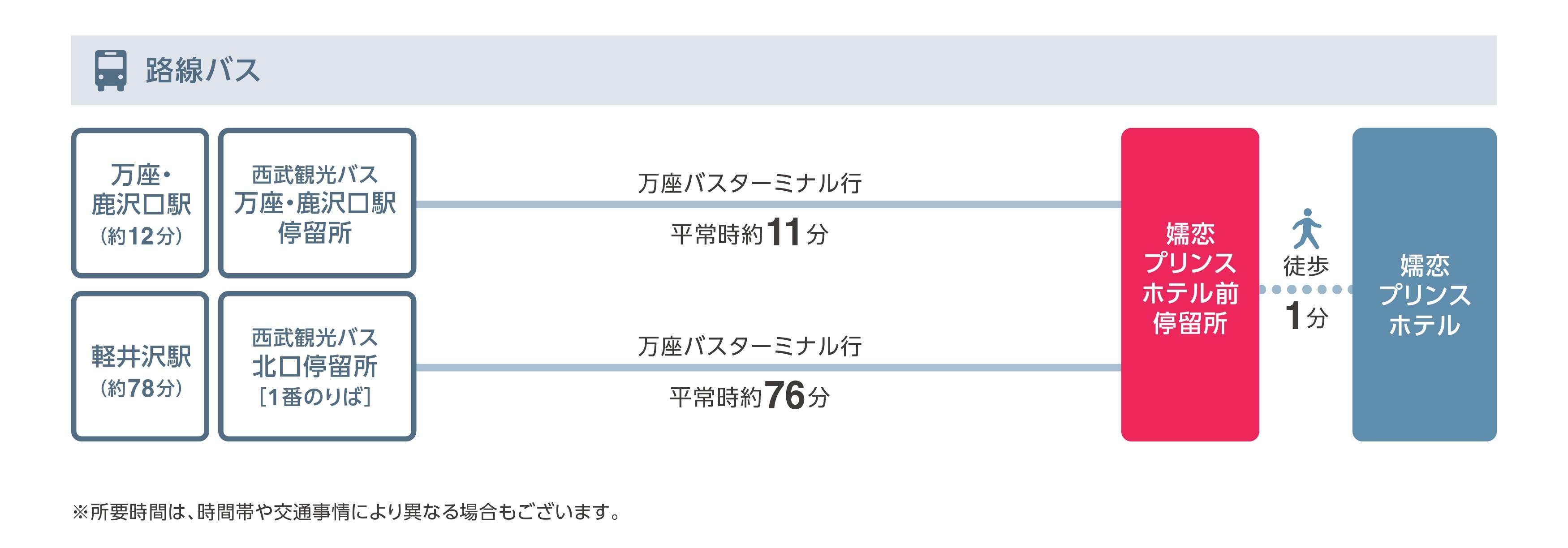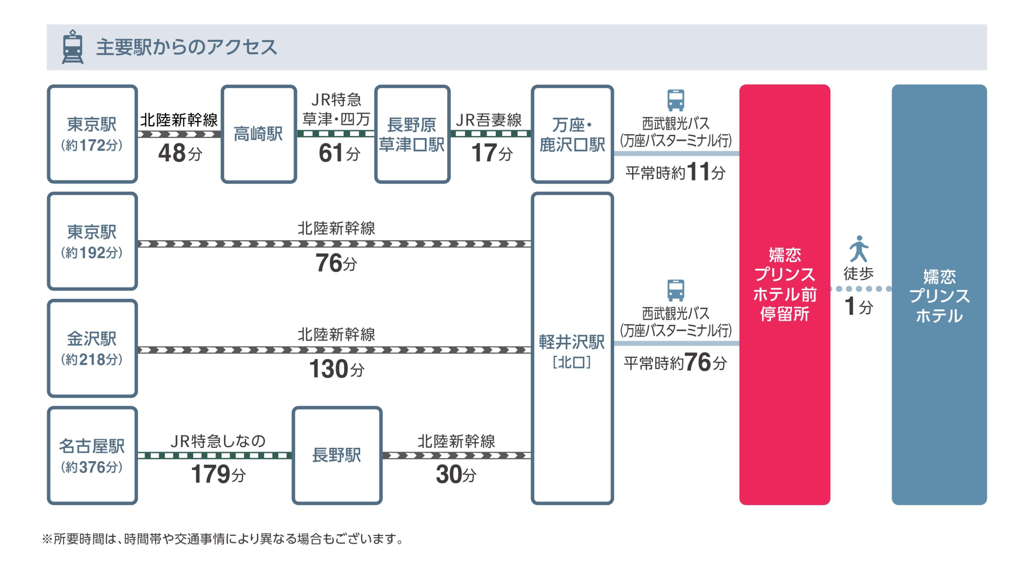 所要時間 タクシーで 平常時10分 万座温泉行バスで 10分 ※新幹線軽井沢駅から定期路線バスもございますのでお問合せください。