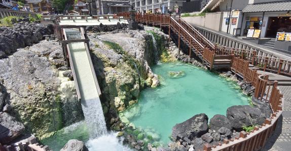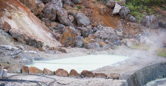 万座温泉の最大の源泉“姥湯”。約80℃のお湯が毎分1,100リットルという豊富な湯量を誇っています。