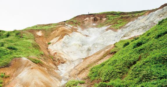 万座温泉のシンボル的な存在。昔、噴火口だった小高い山の中腹からは水蒸気を含んだ火山性ガスが勢いよく吹き出しています。