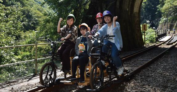 八ッ場ダム建設に伴い付け替えとなった線路の一部を活用し、誰でも気軽に吾妻峡及び八ッ場ダム周辺観光を楽しめるように、自転車型トロッコ(愛称:吾妻峡レールバイク アガッタン)の運行を開始いたしました。