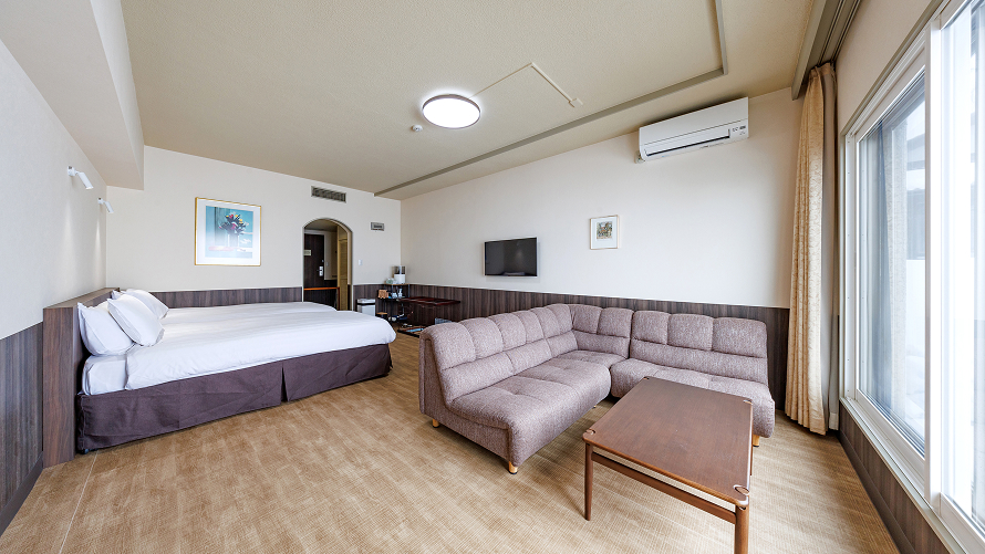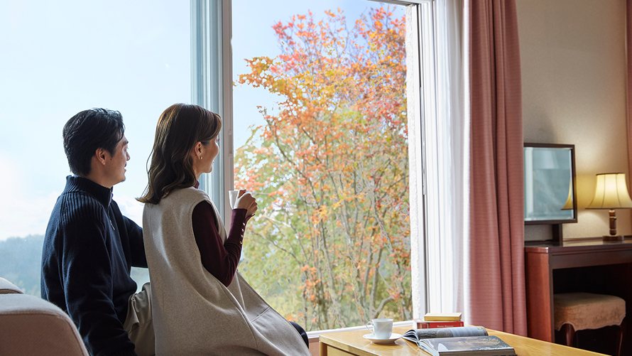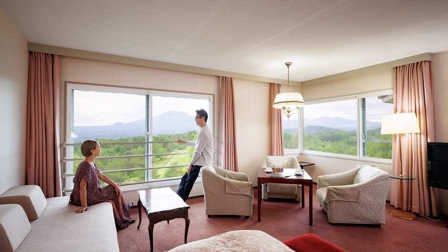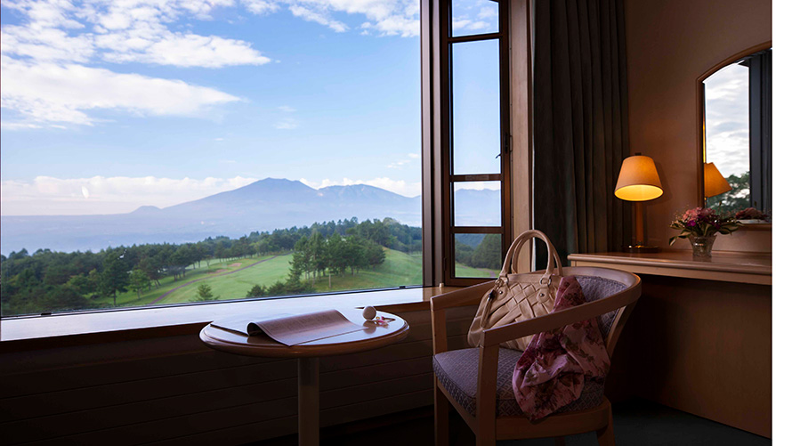 ゆったりお寛ぎいただける、38.7㎡の客室。時間とともに変化する雄大な浅間山の絶景をお部屋からお楽しみください。