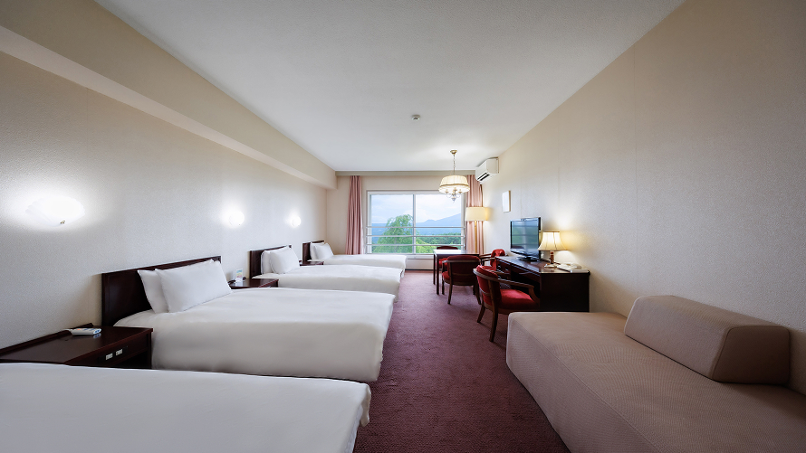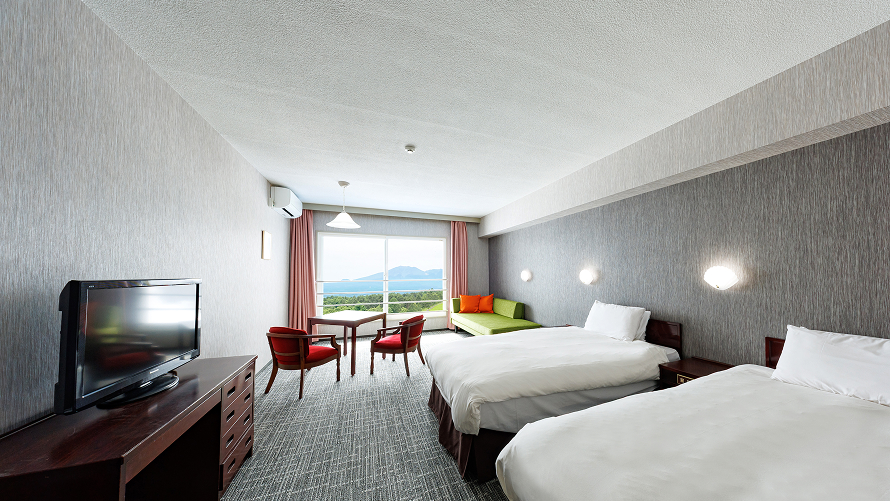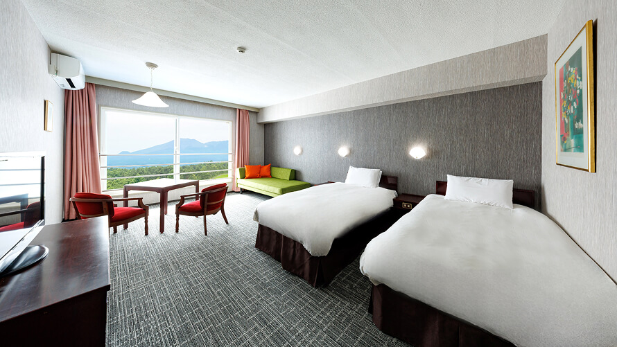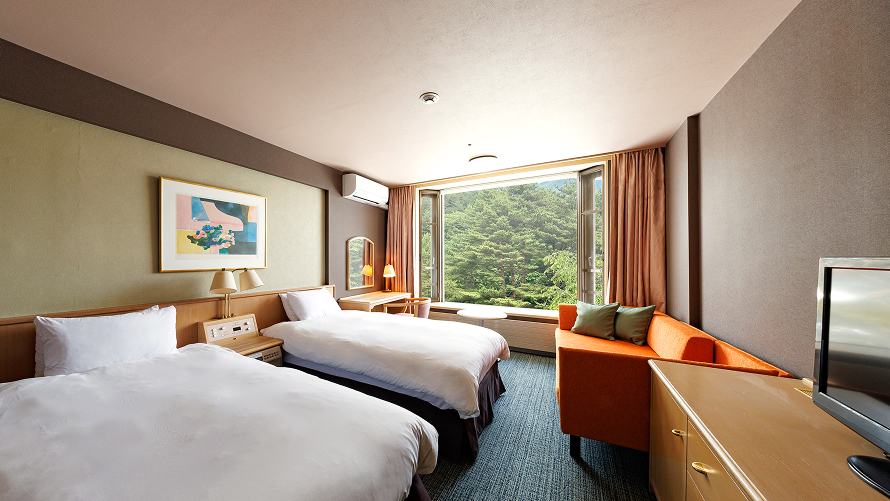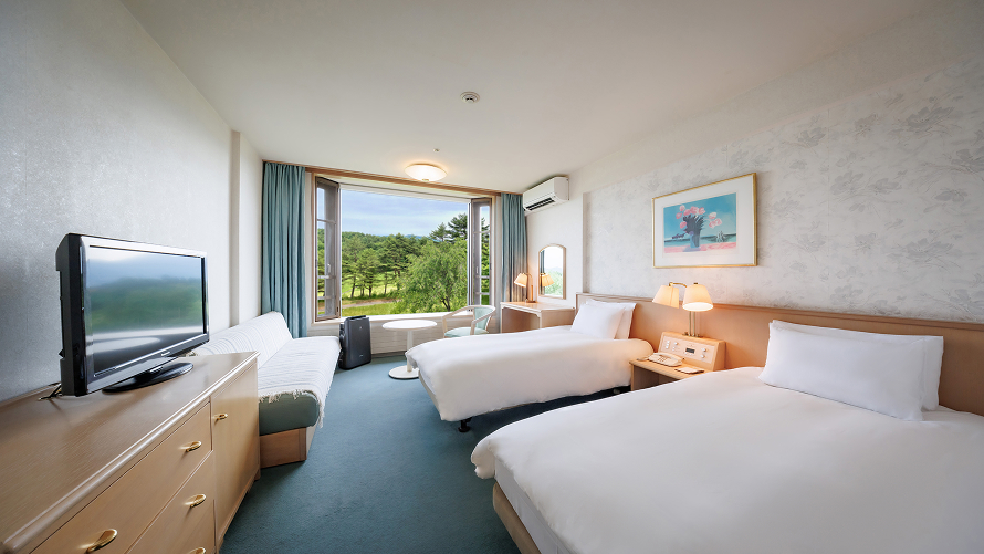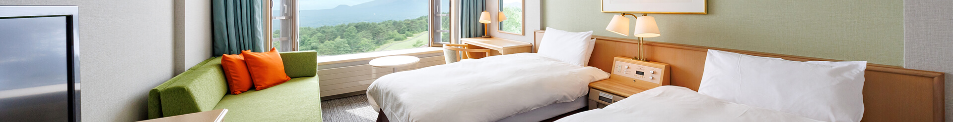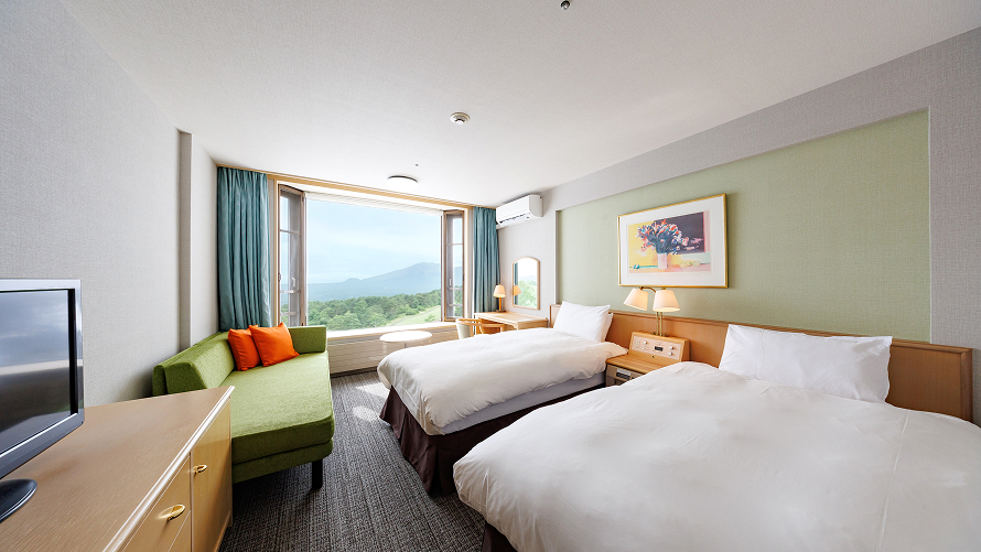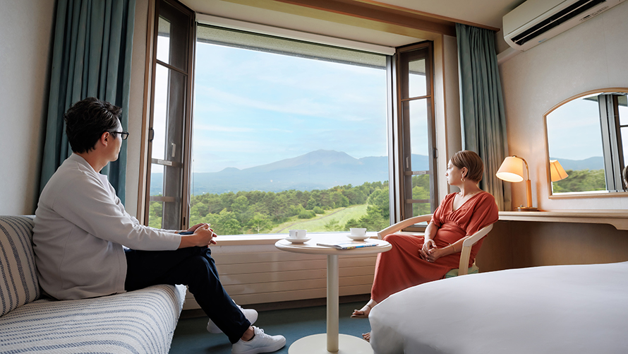 浅間山を望むツインルーム。窓の外に広がる嬬恋高原の緑と奥にそびえる雄大な浅間山をお楽しみください。