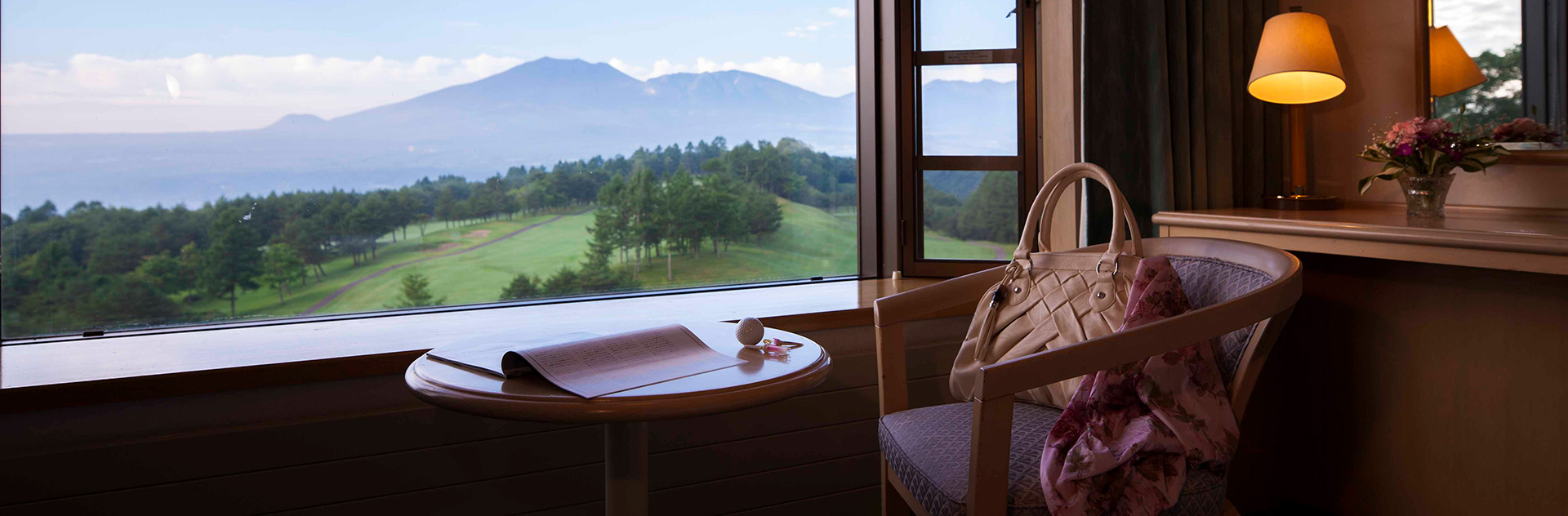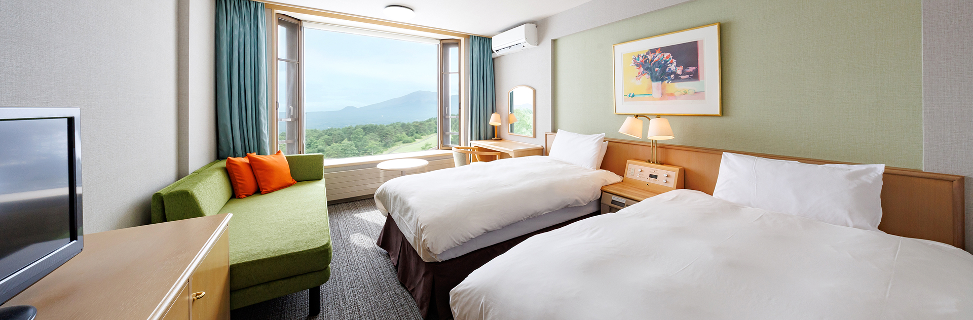 浅間山を望むツインルーム。窓の外に広がる嬬恋高原の緑と奥にそびえる雄大な浅間山をお楽しみください。