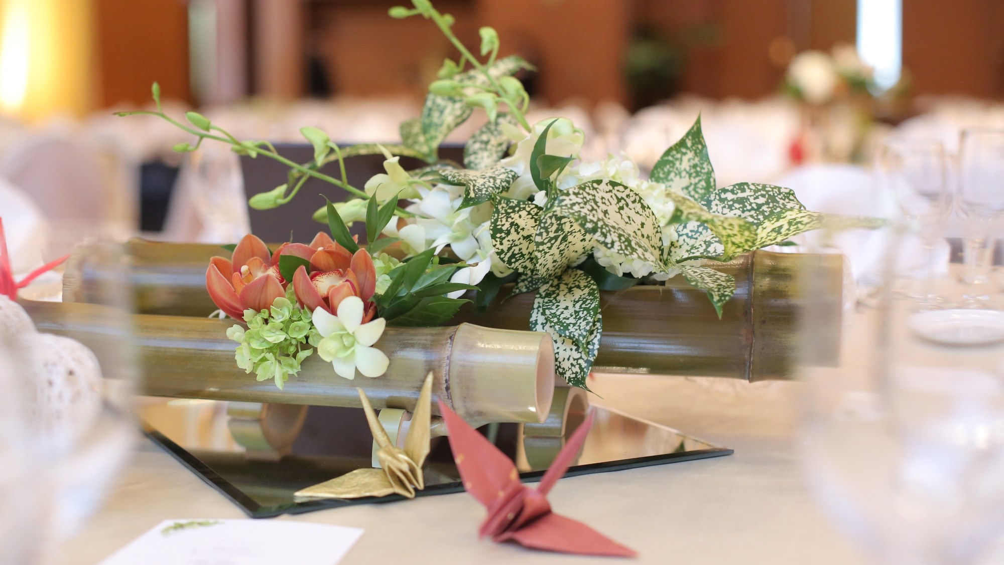 テーブルの花器は竹を使用することにし、自分たちで伐採に行き細かくカット。