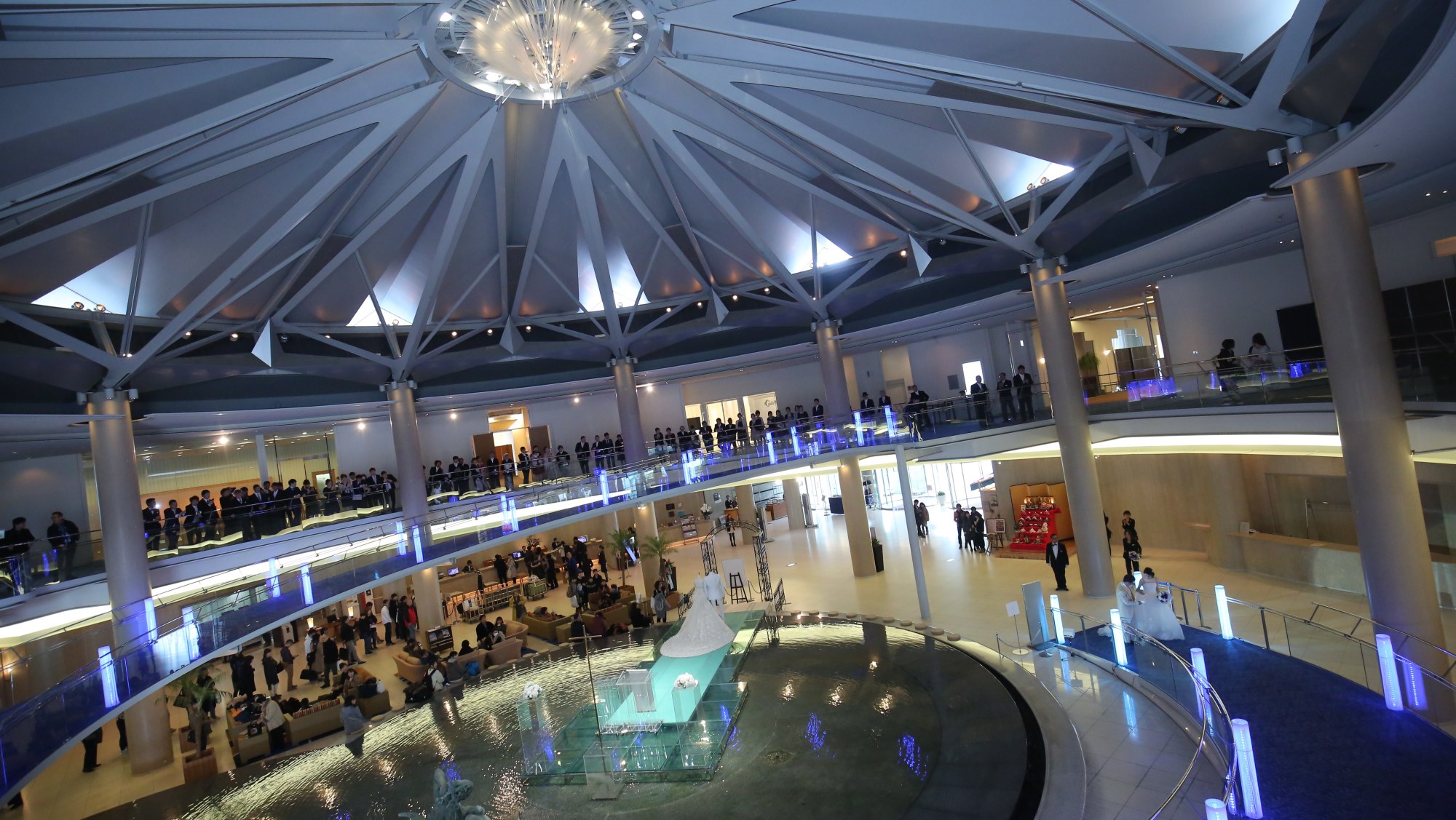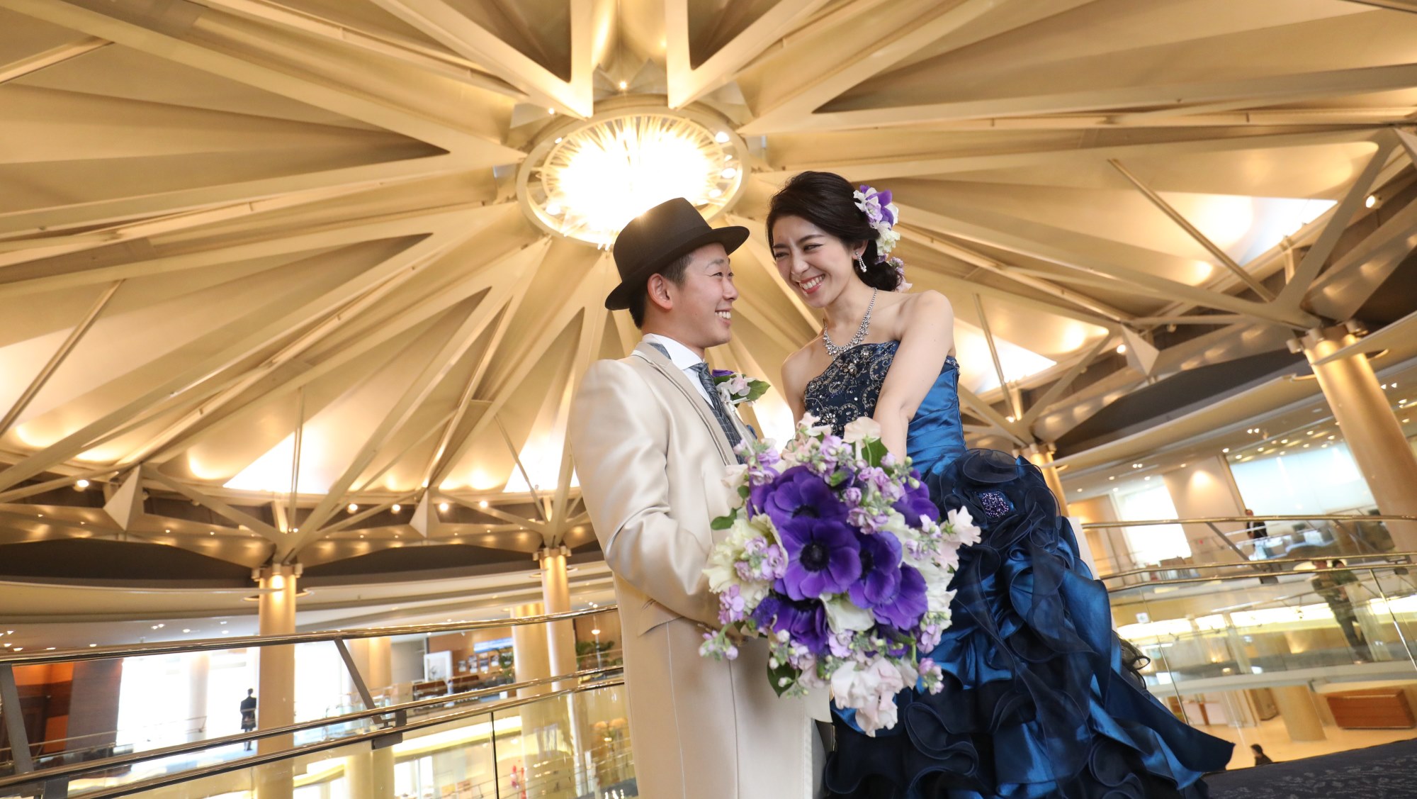披露宴の前に、吹き抜けロビーのスロープを歩く、
