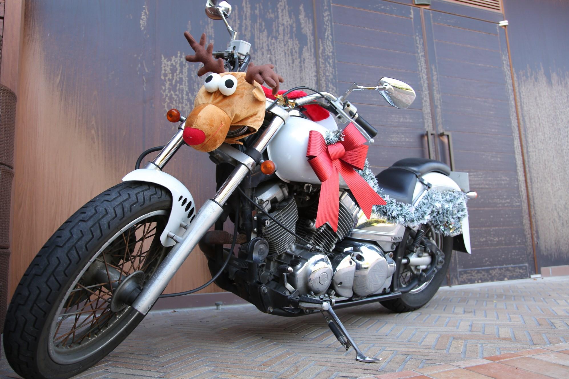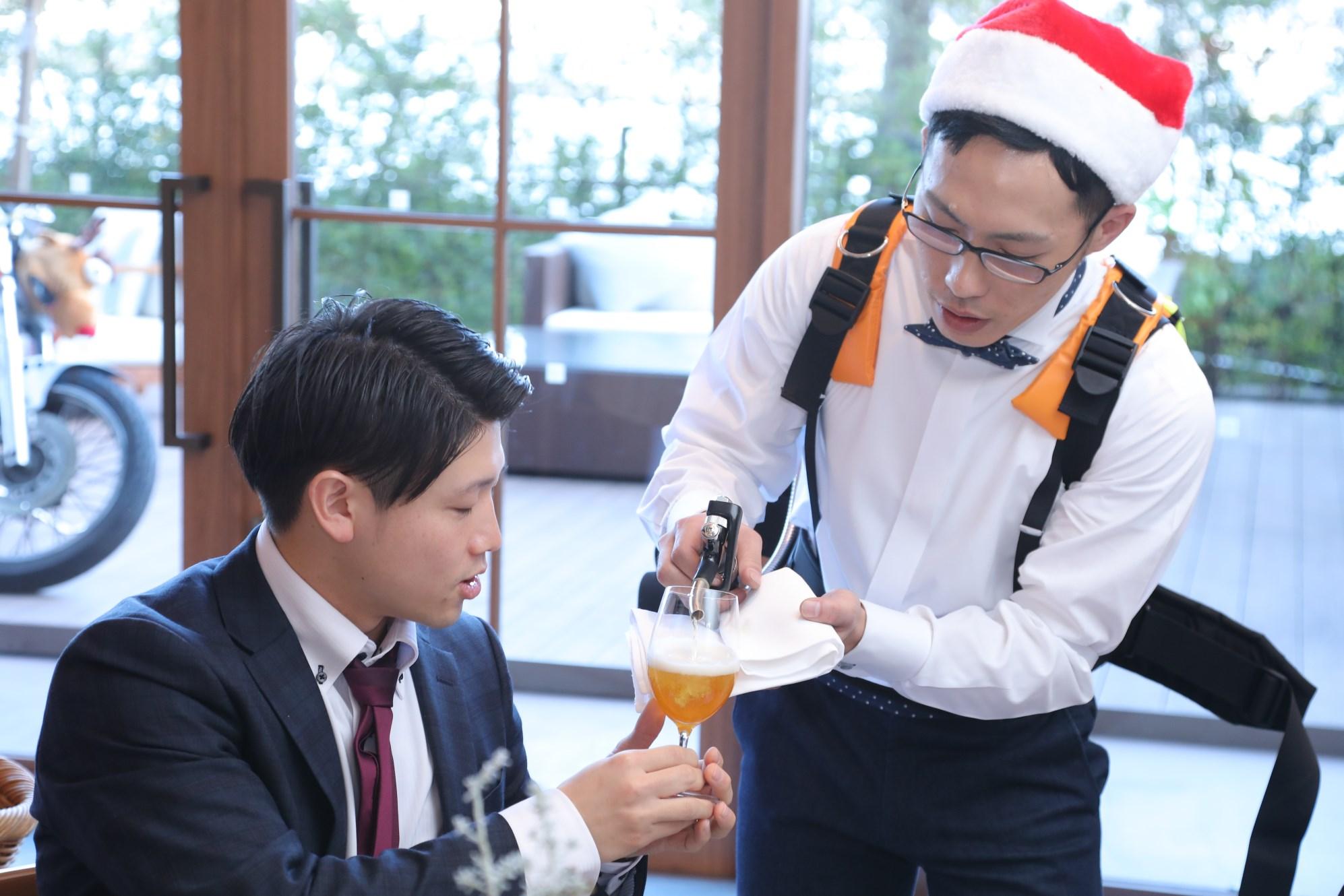ビールサーブの際にクリスマスということで新郎がサンタになり持参したバイクをトナカイに装飾して登場しました。