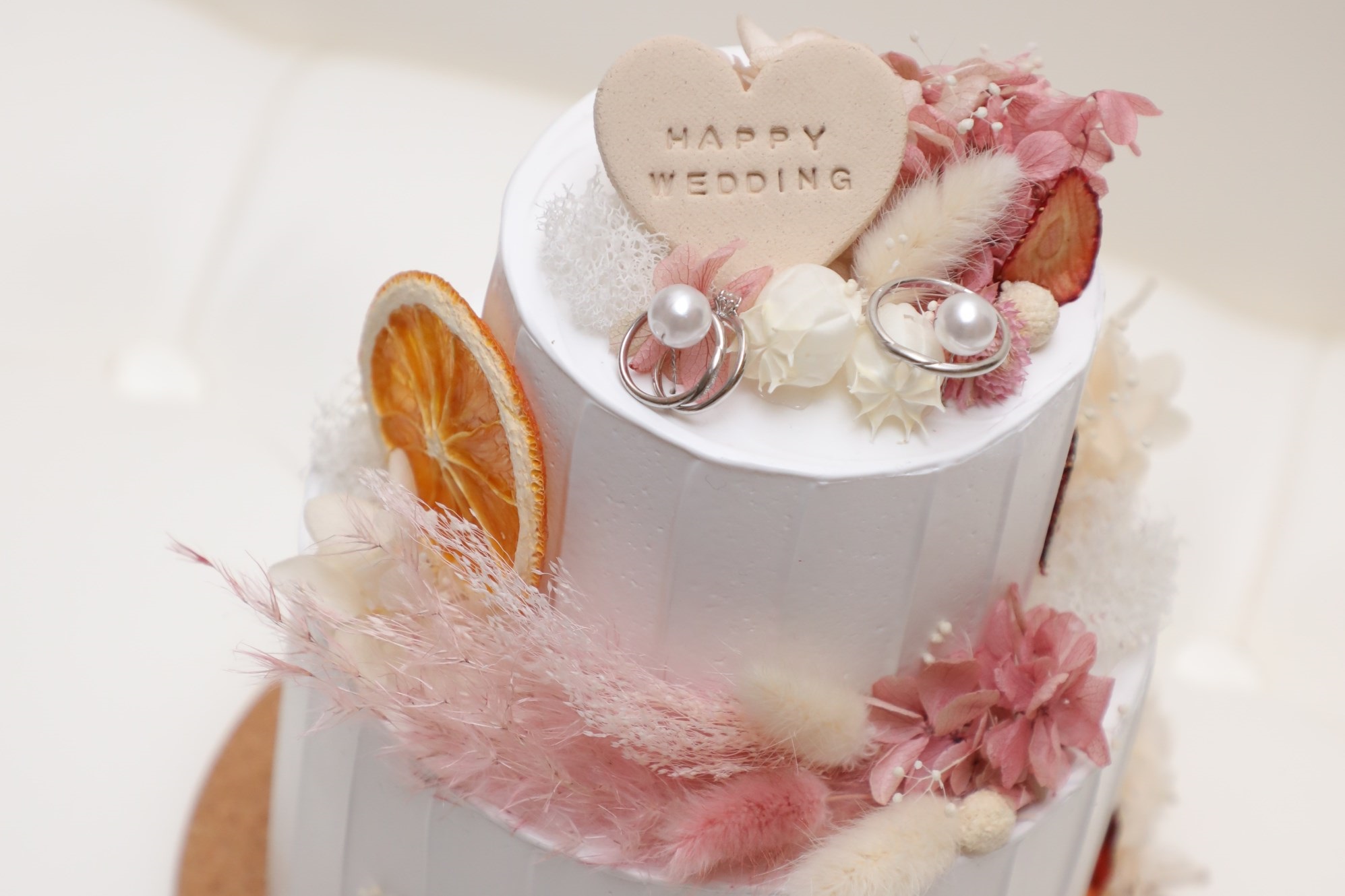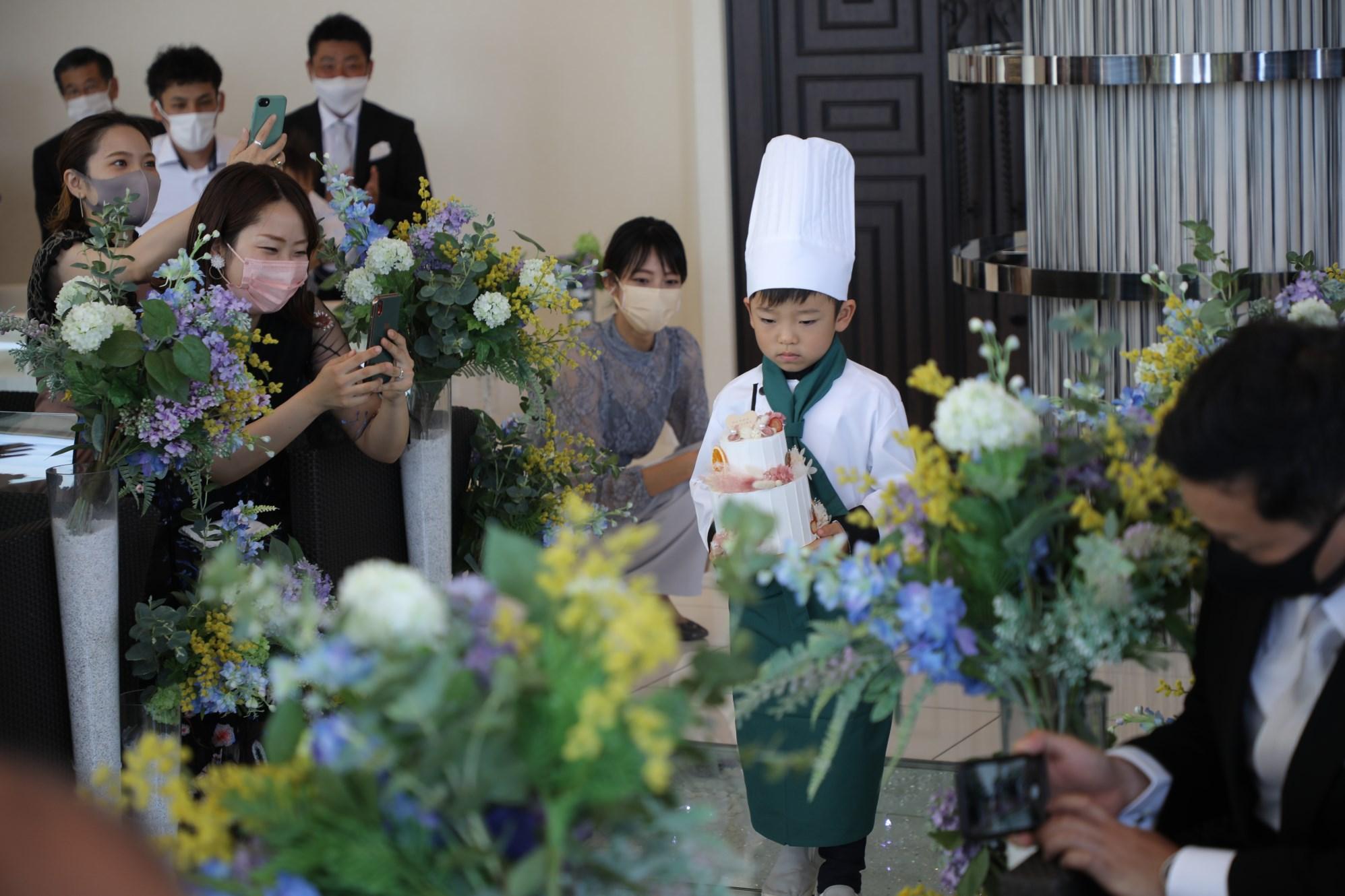友達の子どもにリングボーイをお願いして、リングピローがケーキ型だったので