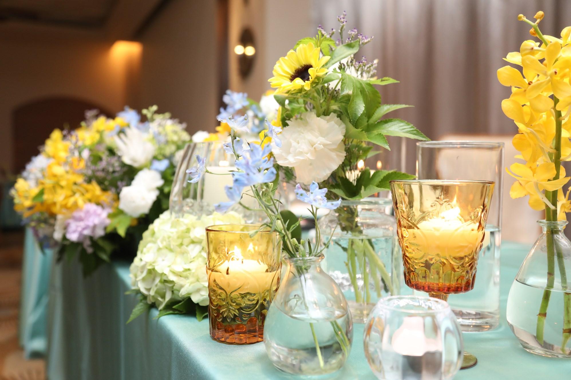 テーブルクロスやお花も、夏っぽい爽やかなカラーで統一しました。