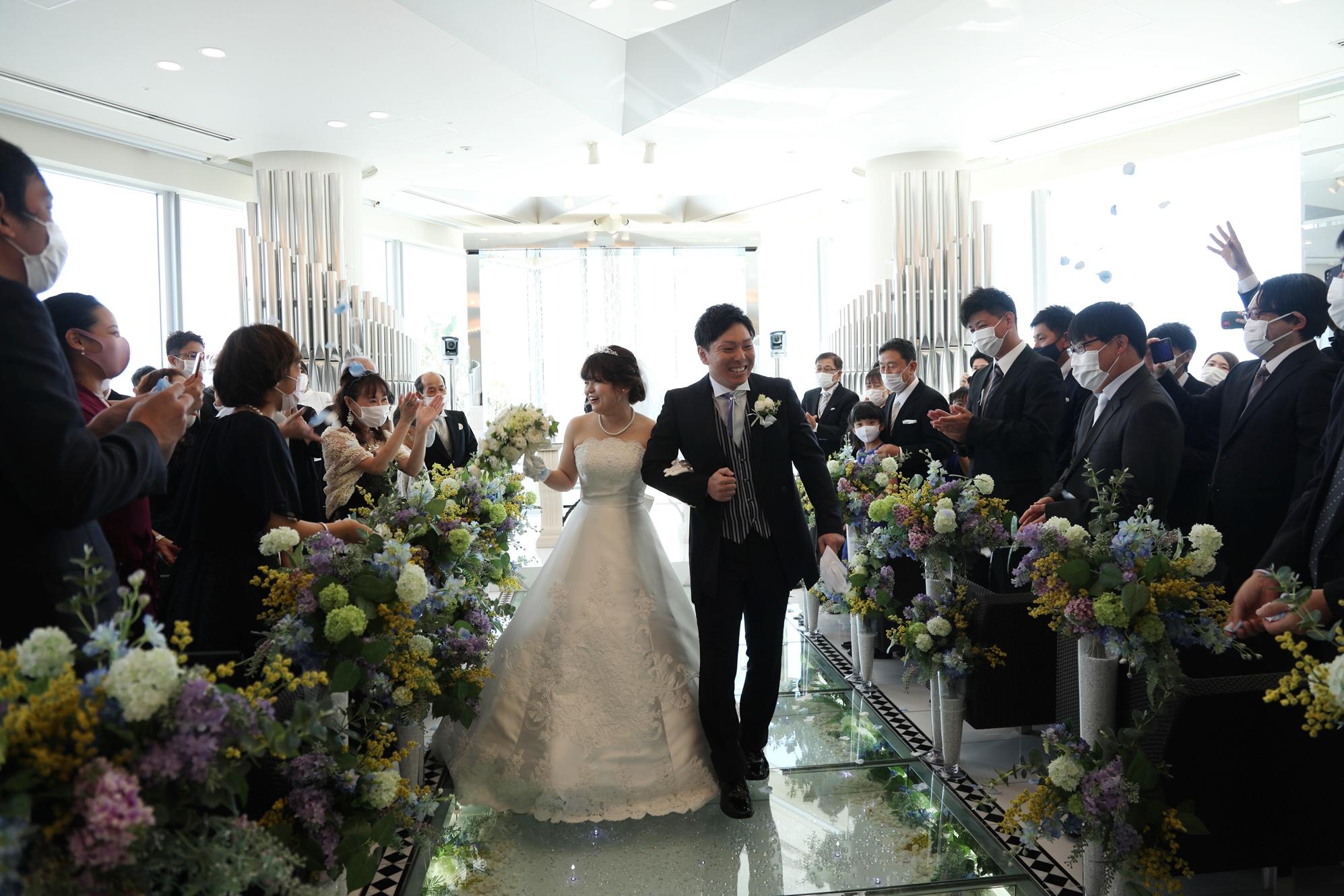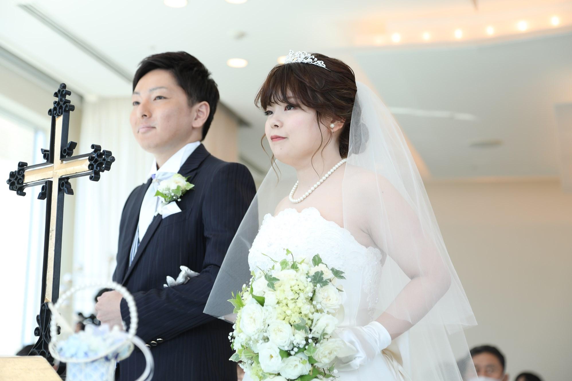 挙式当日は快晴で、チャペルから見える海がキラキラしていて幻想的でした。