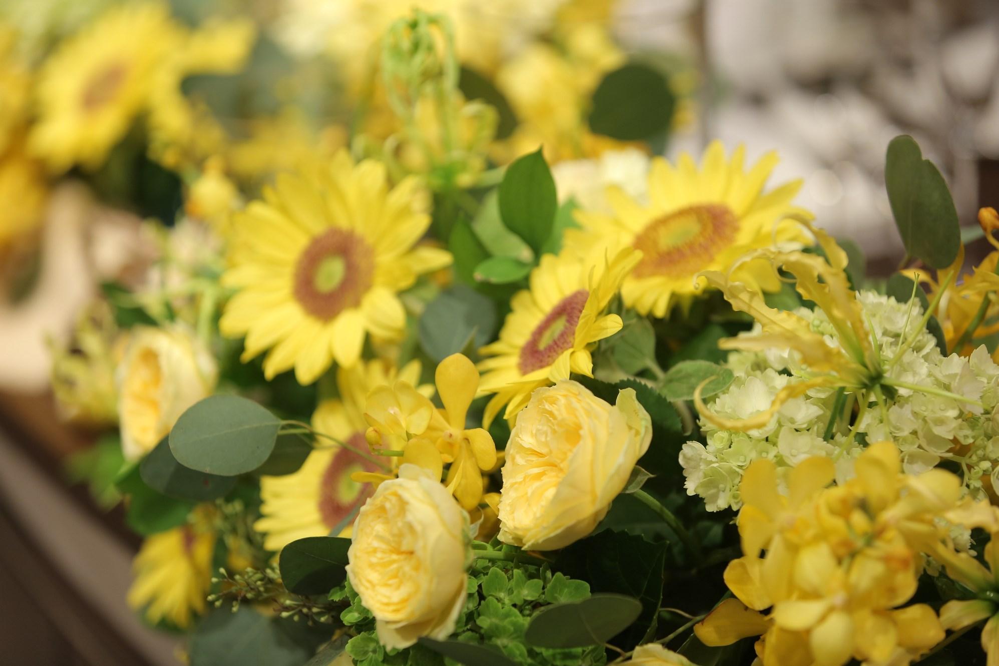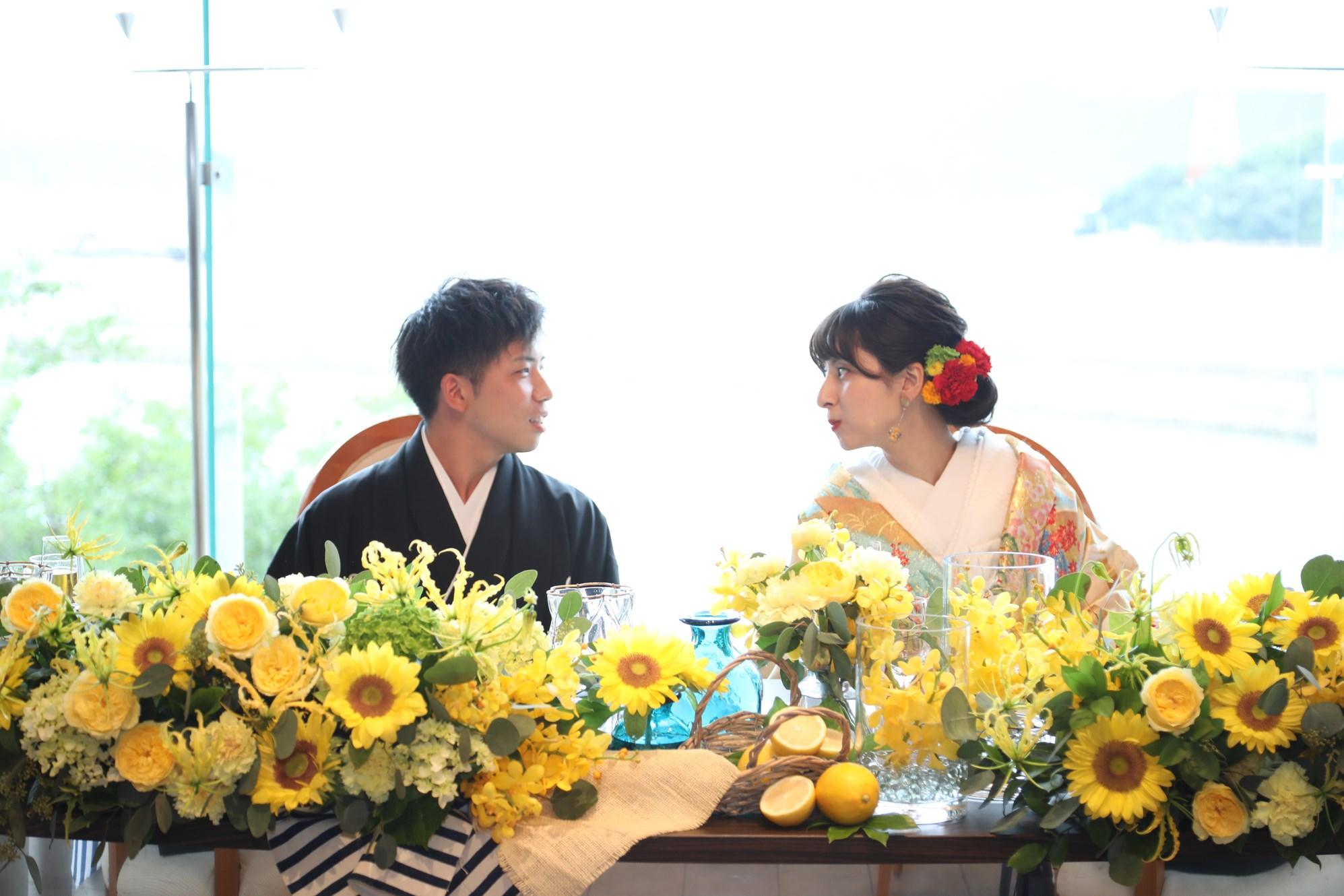 青い海と黄色の花の装飾が2人とも好きな雰囲気でこの感じ以外考えられないと思いました。
