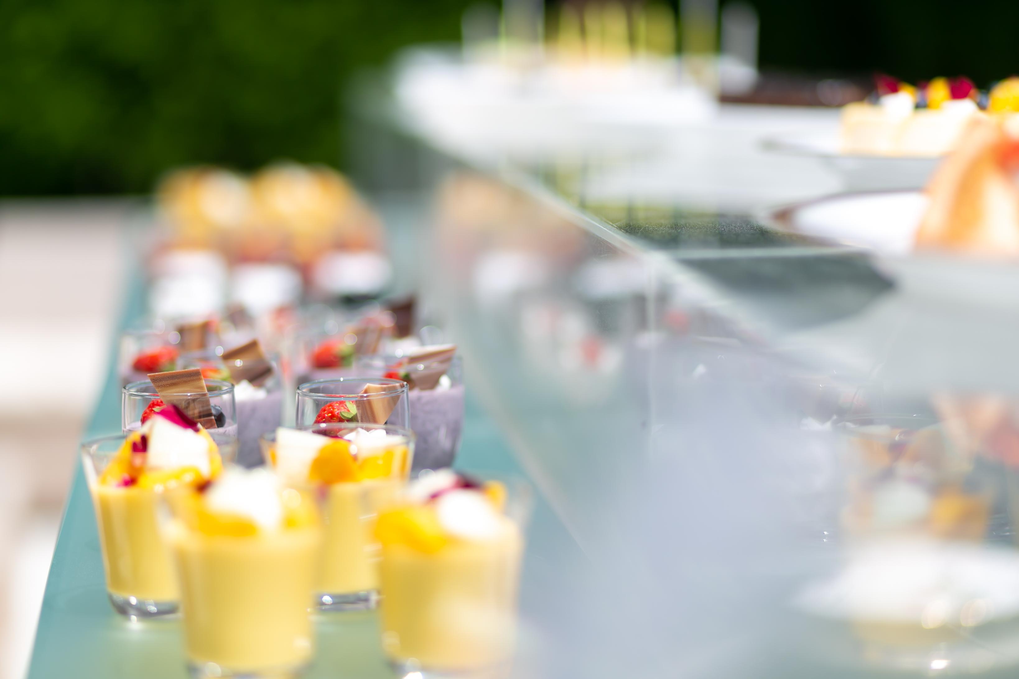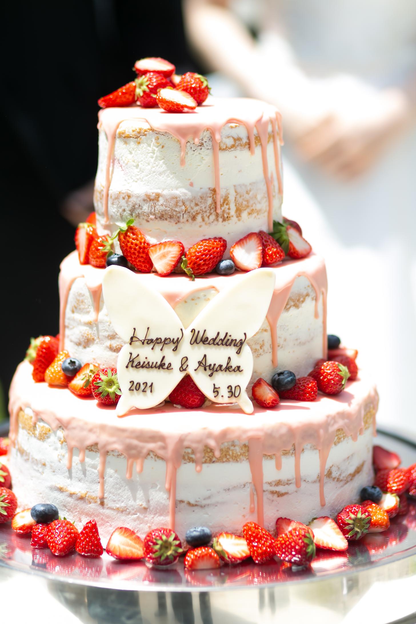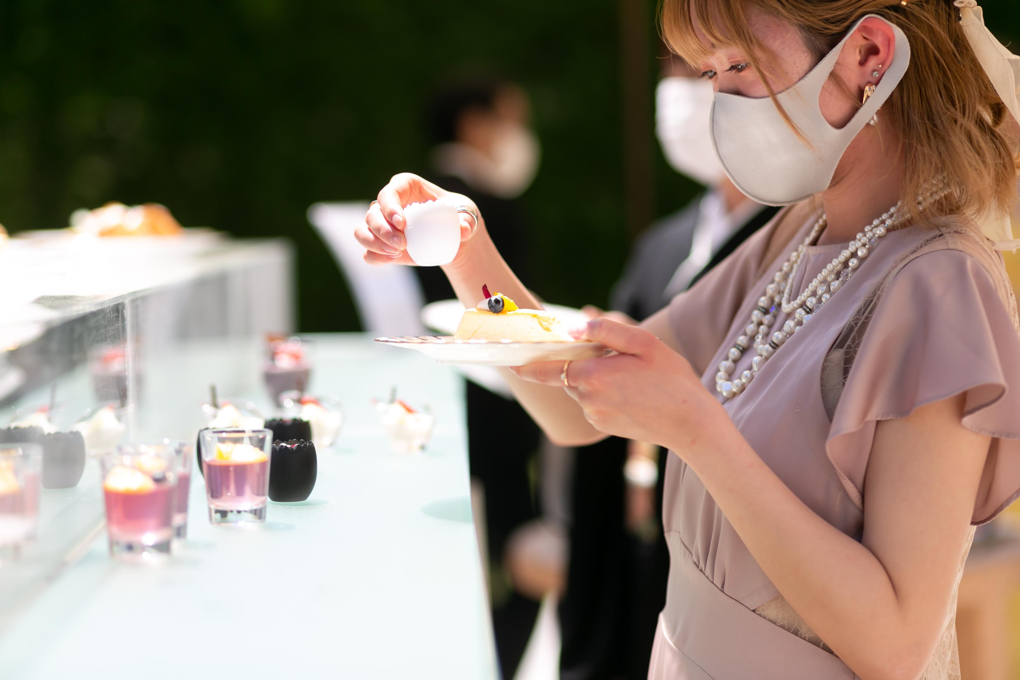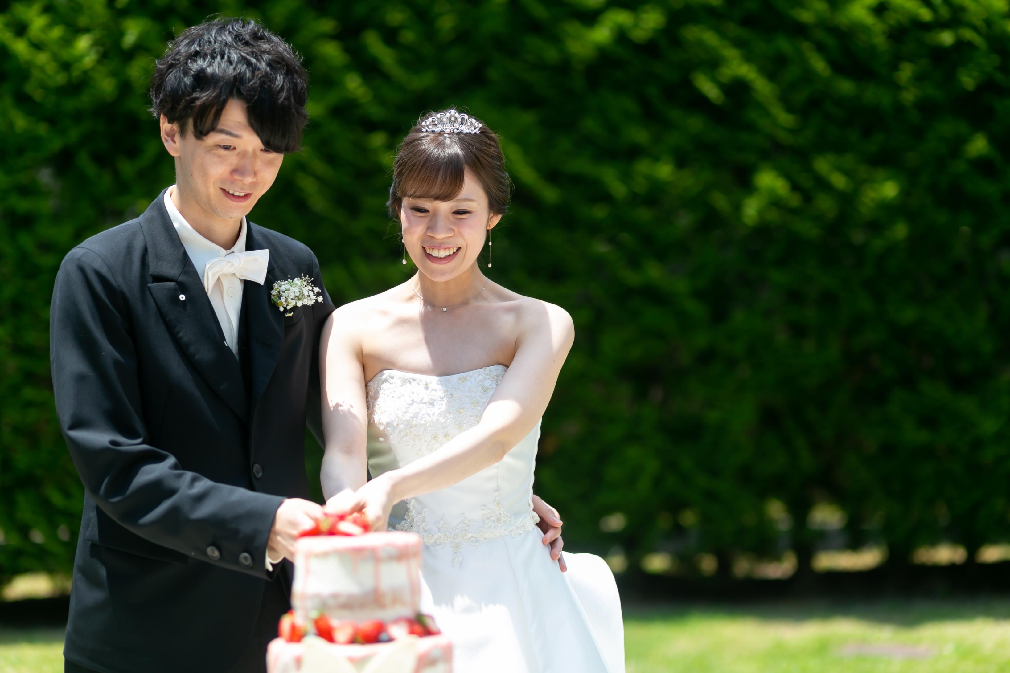 ガーデンでのケーキ入刀とデザートビュッフェは晴天にも恵まれ、青と緑のコントラストがとても綺麗でした。