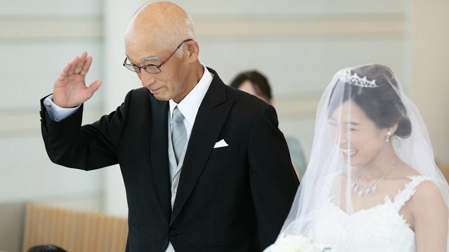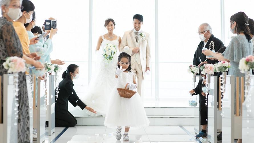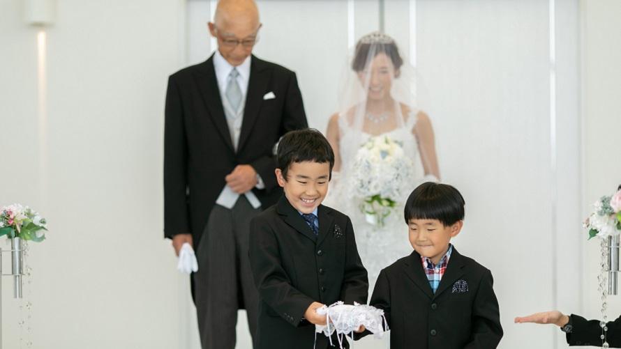 リングボーイ、フラワーシャワーを甥、姪に頼み、家族で創り上げる和やかな挙式を心がけました。新婦は三姉妹の末っ子ですが、新婦の父はバージンロードを娘と歩いたことがなく、どうしても父と歩きたいと強く思い父にお願いしました。最初は嫌がっていた父も、最後は笑顔で楽しそうに一緒にバージンロードを歩いてくれました。